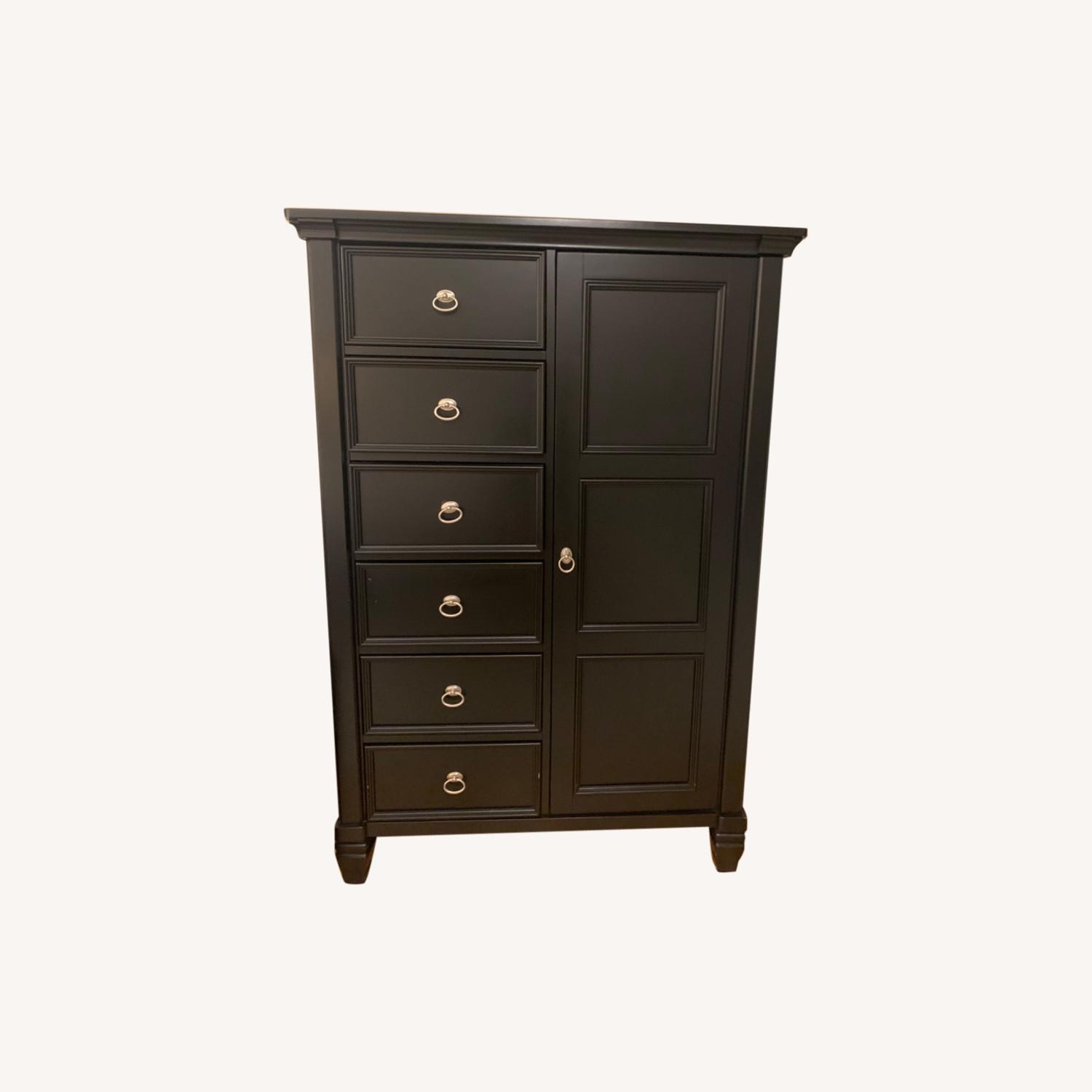 Seller's Notes:Black armoire with drawers on the left and lots of storage in cabinet to the right with three lower pull out drawers. Apple storage and gray condition. Selling matching Queen bed and dresser.