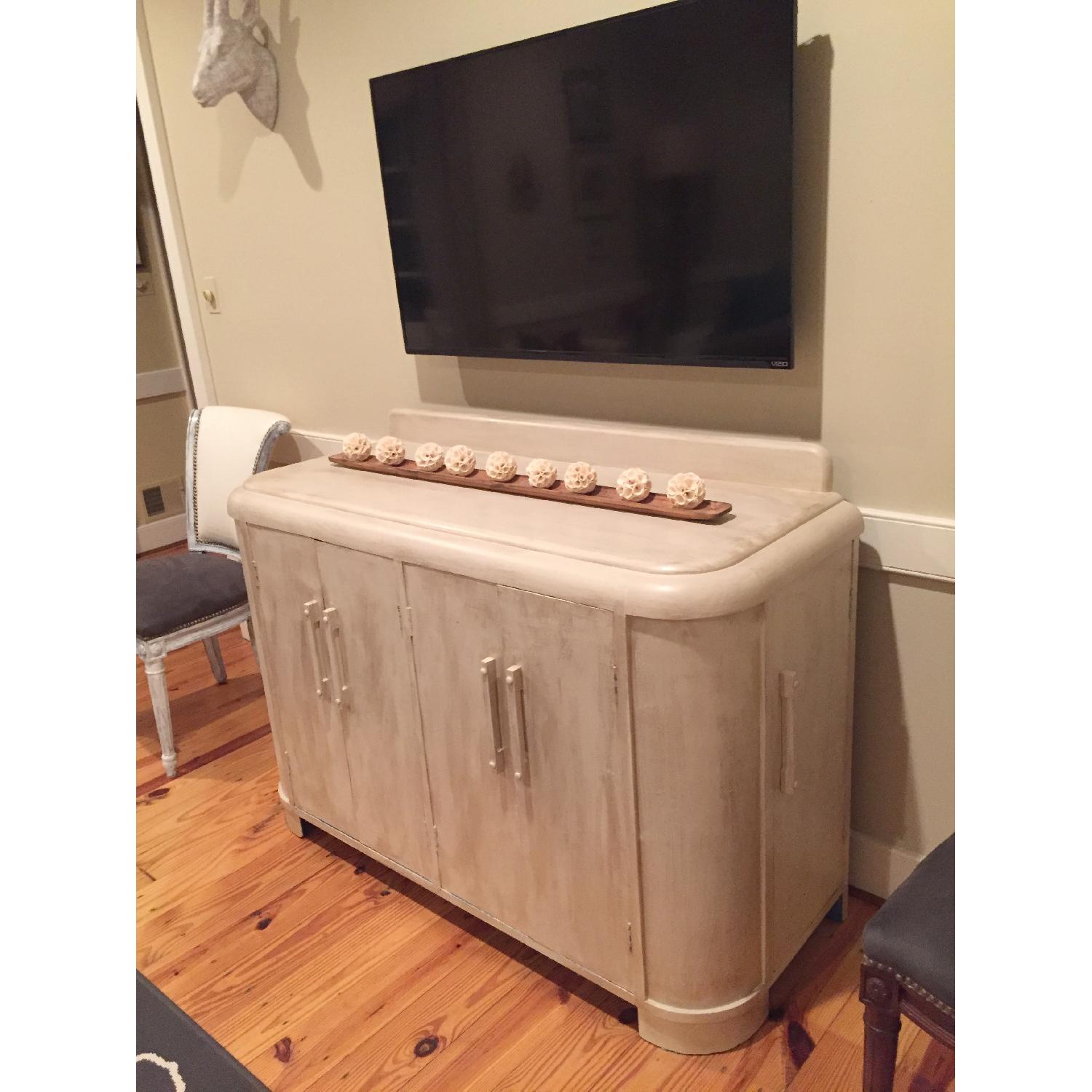 Seller's Notes:One-of-a-kind Art Deco Bar Cabinet! A true conversation piece. Circa 1920. Solid wood - unbelievably fine craftsmanship. Hand-painted - putty/metallic color on exterior with surprise pop of azure on the interior. HUGE amount of storage space for bar ware, serving pieces, liquor bottles, dishes. Left front cabinet has two generous shelves. Right front cabinet has one large shelf and three big drawers lined with felt to protect your serving pieces. Two shallow side cabinets store liquor bottles, bar ware, mixers. This piece is an absolute gem. Redecorating so no longer need, but have loved this piece. Purchased from Georgetown Flea Market and custom painted.