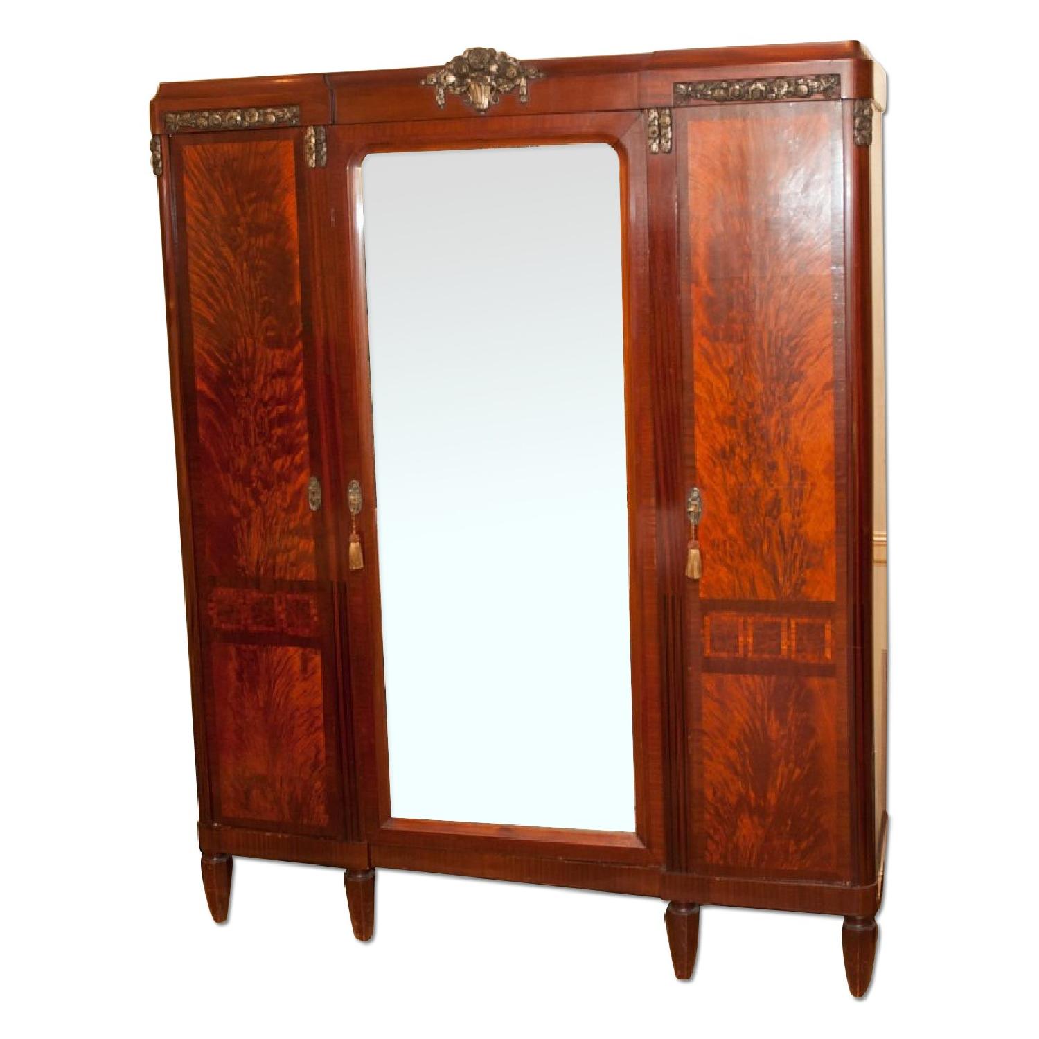 Art Deco Burled Maple Wood Armoire with Mirror and Brass Gilt details