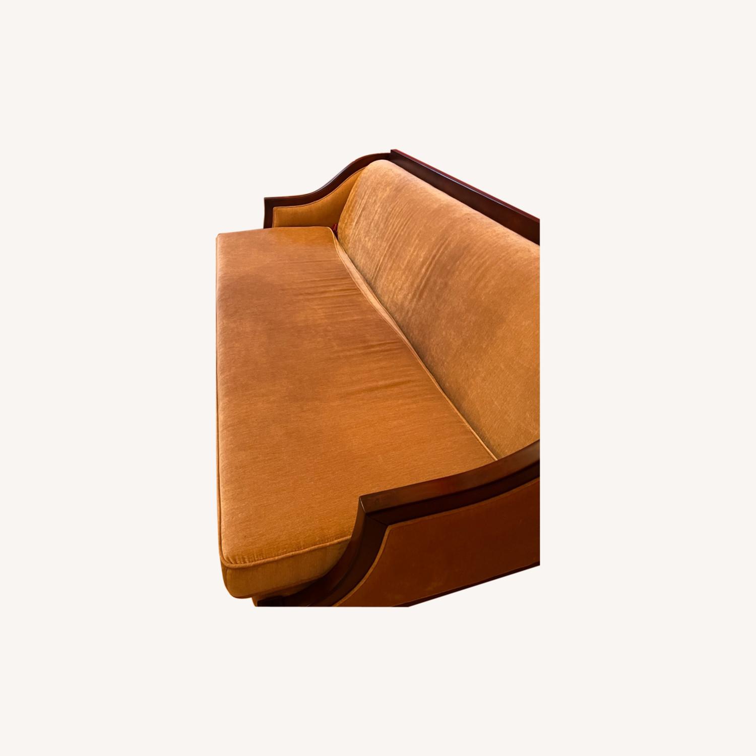 Seller's Notes:Art Deco couch made with real Mahogany woody. Sunset yellow chenille fabric. No damage. Minor scrapes on legs of couch Comfy Chair can be included for a fair price.