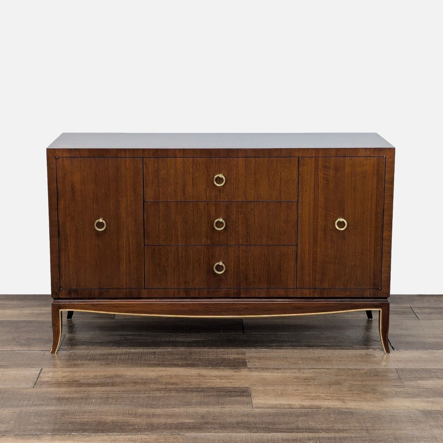 Seller's Notes:This piece is constructed of solid wood mahogany veneer with three center drawers and two cabinet doors with gold tone ring hardware.