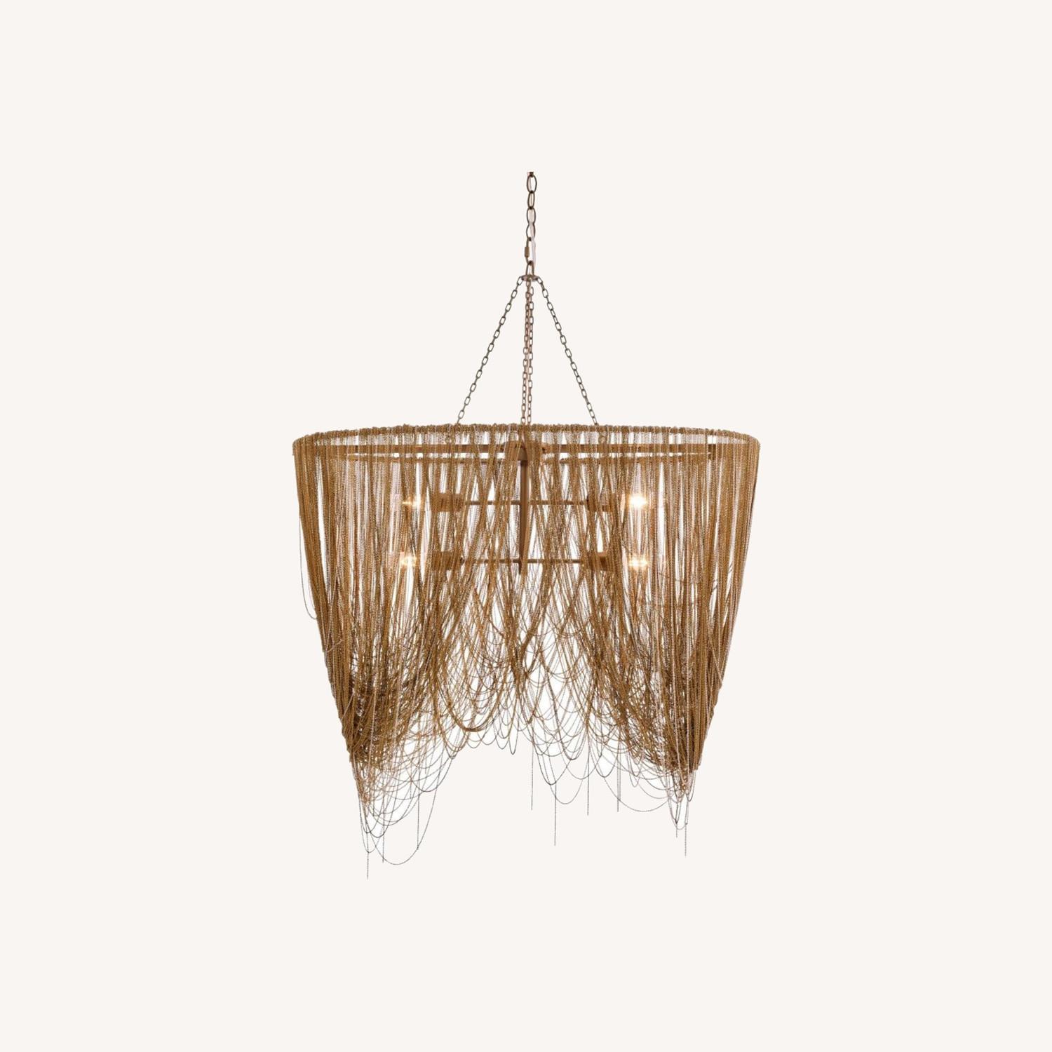 Cascading swags of fine brass chain in antique brass and nickel finishes make this chandelier a dramatic addition to any space. The uneven ends of the delicate chains add to the decadent elegance. Each piece is handmade and will feature slightly different chain placement as well as varying finishes. Shown with Nostalgic spiral radio bulbs. Additional chain available (CHN-942). Damp-rated, although limited covered outdoor areas may affect finish.
