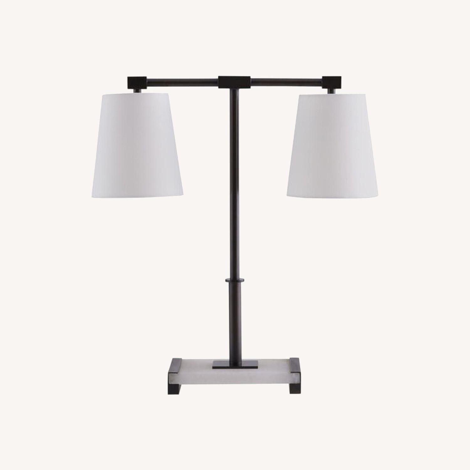 The classic library silhouette of the Messina provides a beautiful balance to any tabletop.. A slender, double-arm frame of bronze steel presents two tapered, off-white linen shades with an off-white cotton lining. The white alabaster base is inset in a matching bronze steel frame for a more cohesive look. Finish will vary.