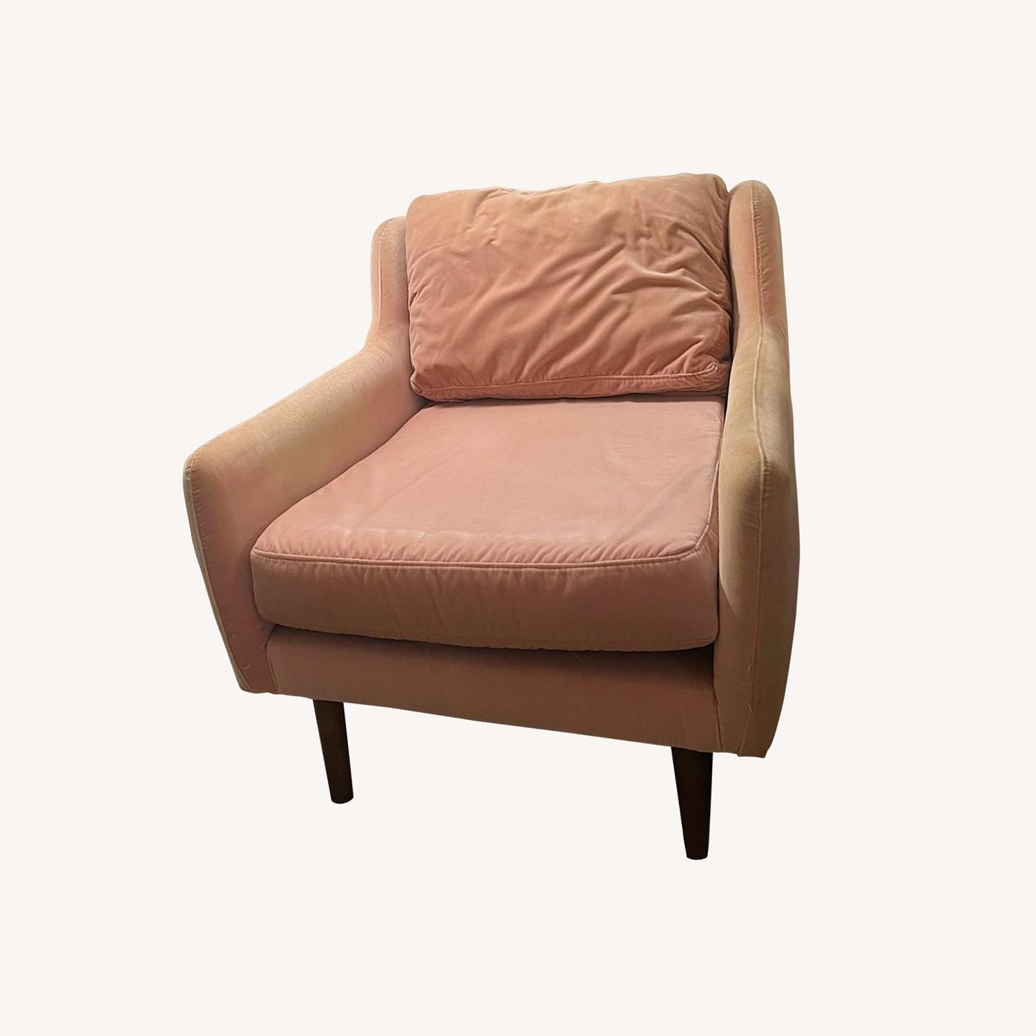 Seller's Notes:Beautiful accent chair from Article in a lush cotton-velvet and accented with solid, walnut-stained wood legs. Built with a sturdy corner-blocked wooden frame and loose seat and back cushions, making it easy to clean. This color is no longer available from retailer. Here is the link to the chair in a different color: https://www.article.com/product/19044/matrix-cascadia-blue-chair There is some light staining so the cushion covers could use a dry cleaning, but the frame is in great shape. Please see pics for all details.