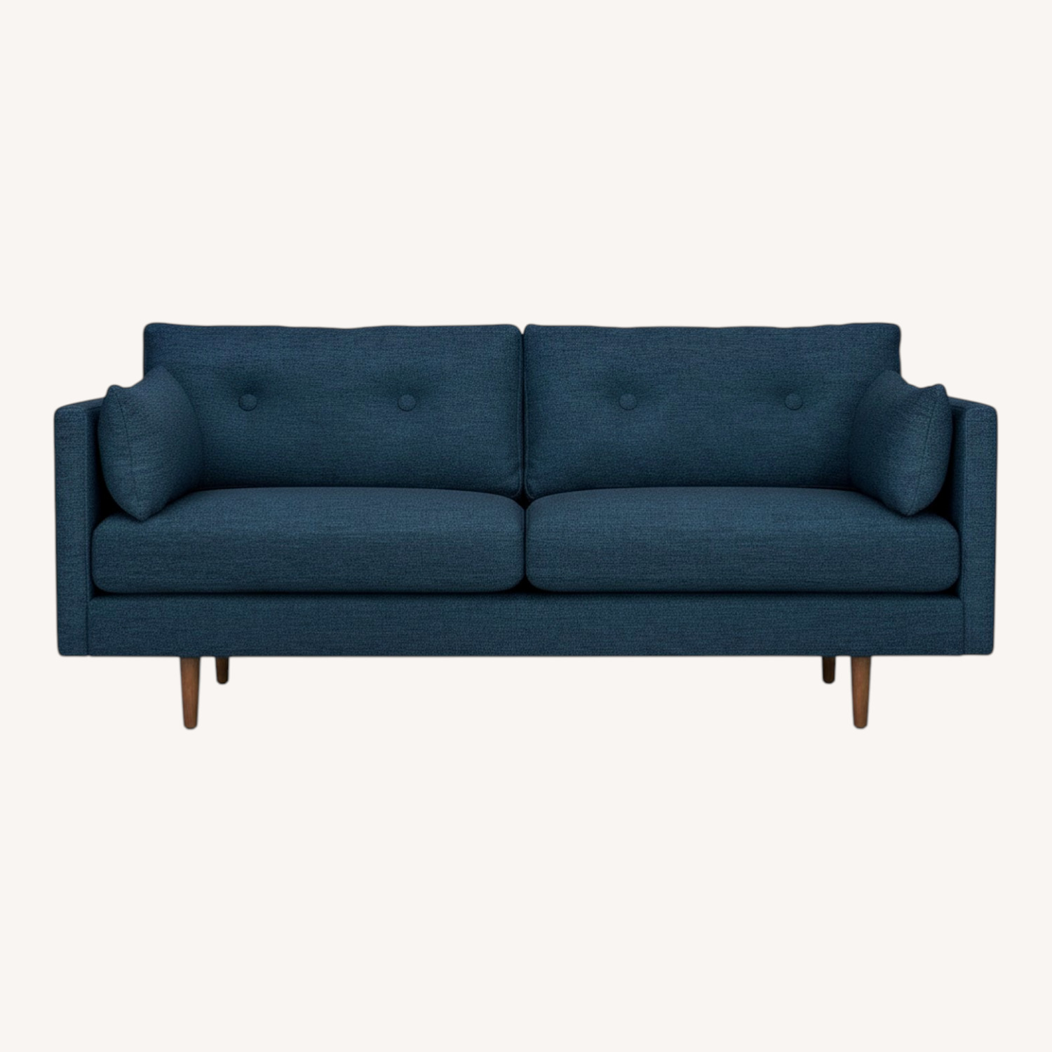 Seller's Notes:This is Article's Anton sofa. It has a nice midcentury modern look with walnut feet. It's in the twilight blue color and has a fabric material. Comes with two side pillows. It's a 2.5 seater but I've found that it comfortably sits 3 people. It's also long enough for many people to lay on except super tall people. I've had many guests crash on this sofa.