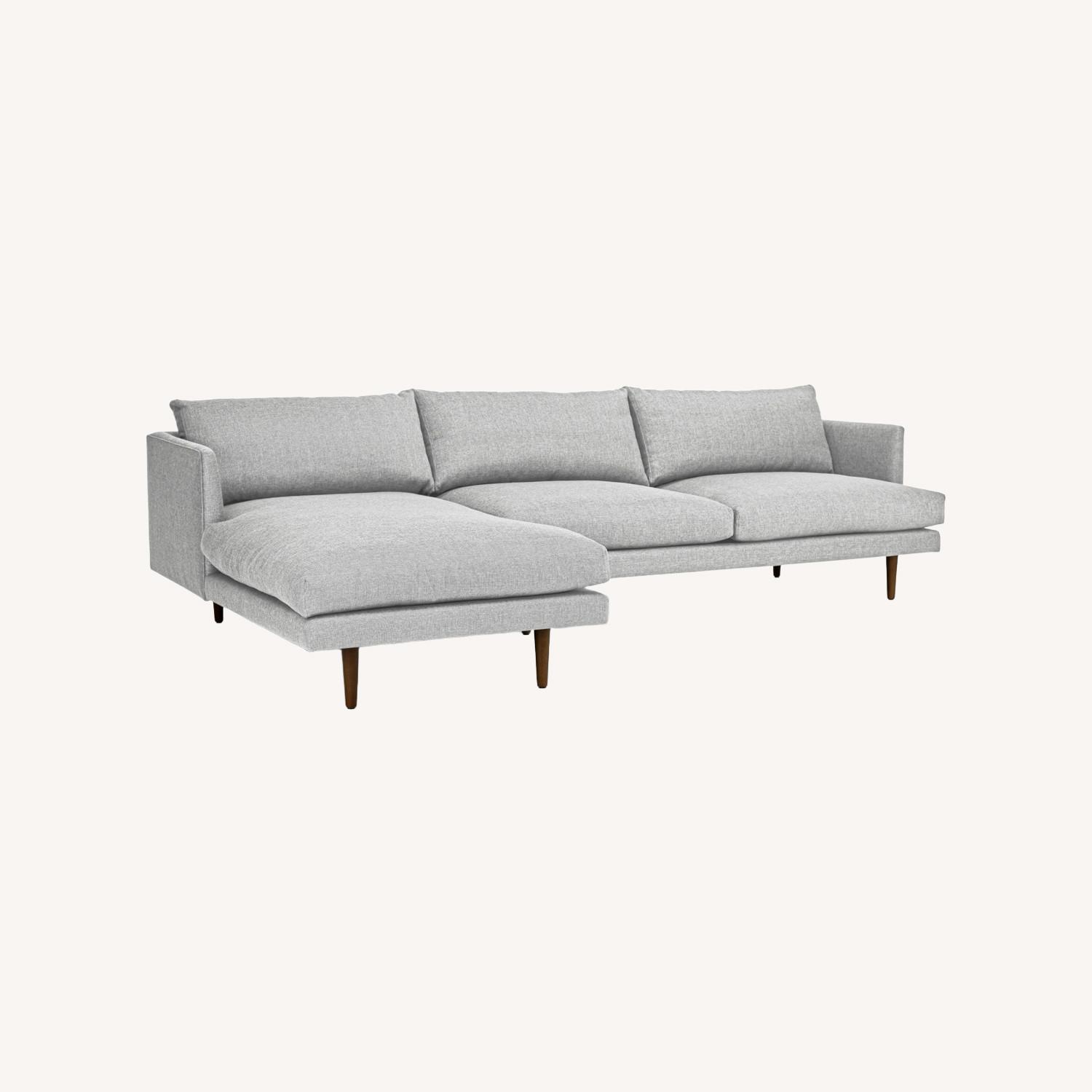 Seller's Notes:Excellent condition — clean, well-maintained, from a smoke-free and pet-free home. This is Article's popular mid-century modern sectional with clean lines, tapered solid walnut legs, and deep, comfortable seats. The frame is solid wood with high-resiliency foam cushions. Upholstered in performance-grade polyester fabric that's durable and easy to care for.