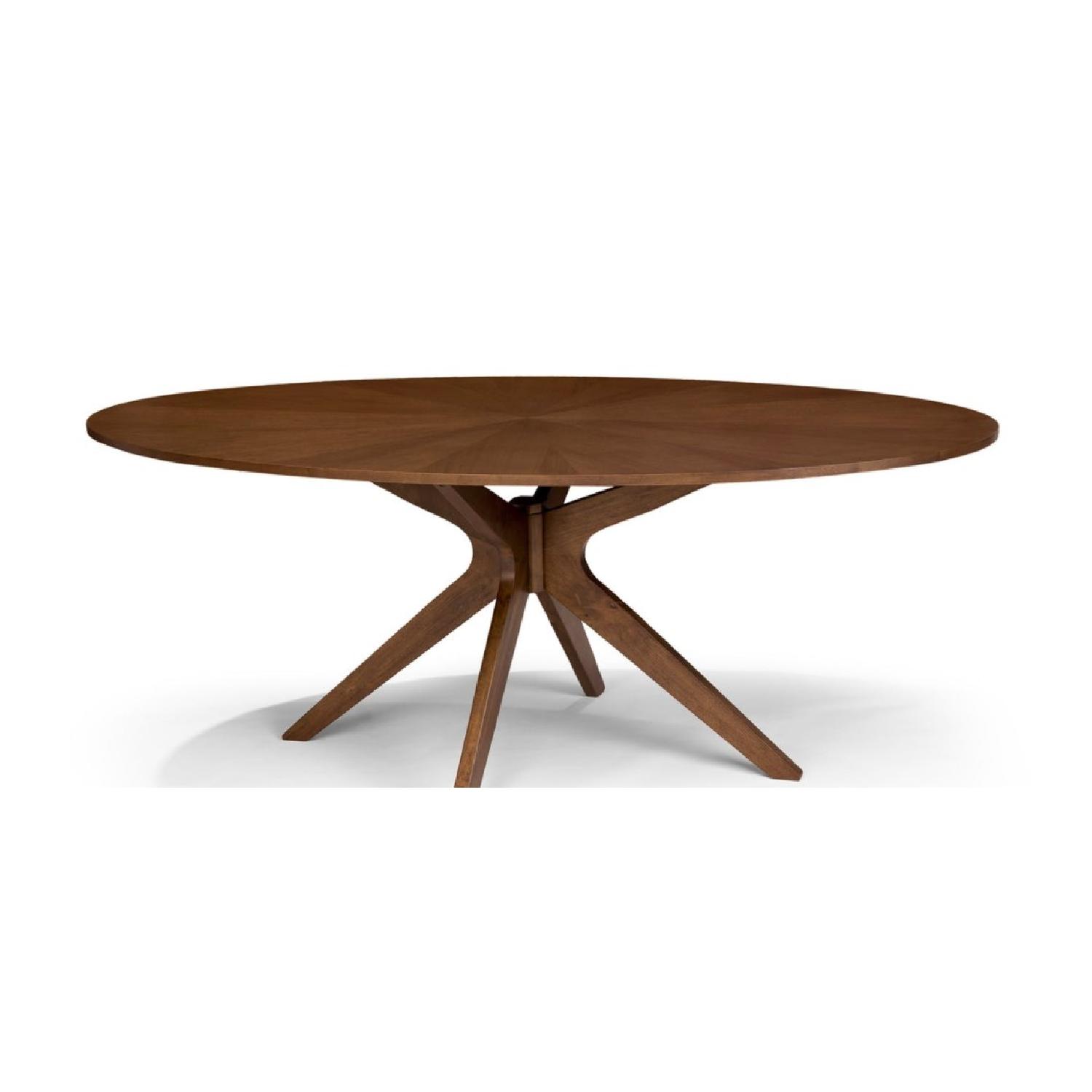 Seller's Notes:Few scratches, otherwise perfect condition - less than 1 year old Big, luxurious and versatile make up the characteristics of the Conan dining table. A stunning sunburst wood veneer top adds glamour while its dynamic centered leg design lends it a wonderful sculptural feel. CONSTRUCTION STYLE/TYPE Mid century modern oval wood dining table GENERAL DIMENSIONS 29"H x 75"W x 43.5"D WEIGHT (LBS) 68 WOOD STAIN Walnut MATERIALS Solid Rubber wood legs with an Ash veneer SKU NO. SKU45 FEATURES Constructed of solid wood and wood veneer in a Walnut stain Ideal for everyday use as well as throwing dinner parties Seats six Some assembly required (approximately 45 minutes)