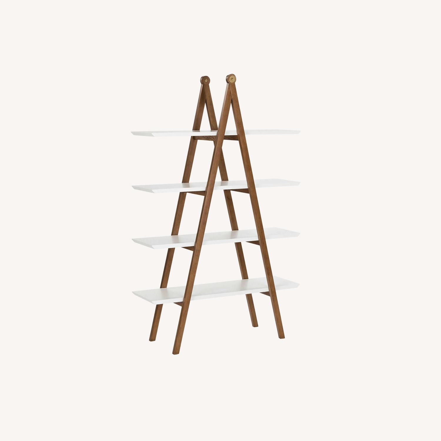Beautiful ladder-style shelving unit perfect for kitchen, dining area, or stylish storage. Sturdy wood frame with five wide white shelves offering tons of display and organization space. Can hold dishes, glassware, pantry items, decor, plants, or books. Gently used and in excellent condition.