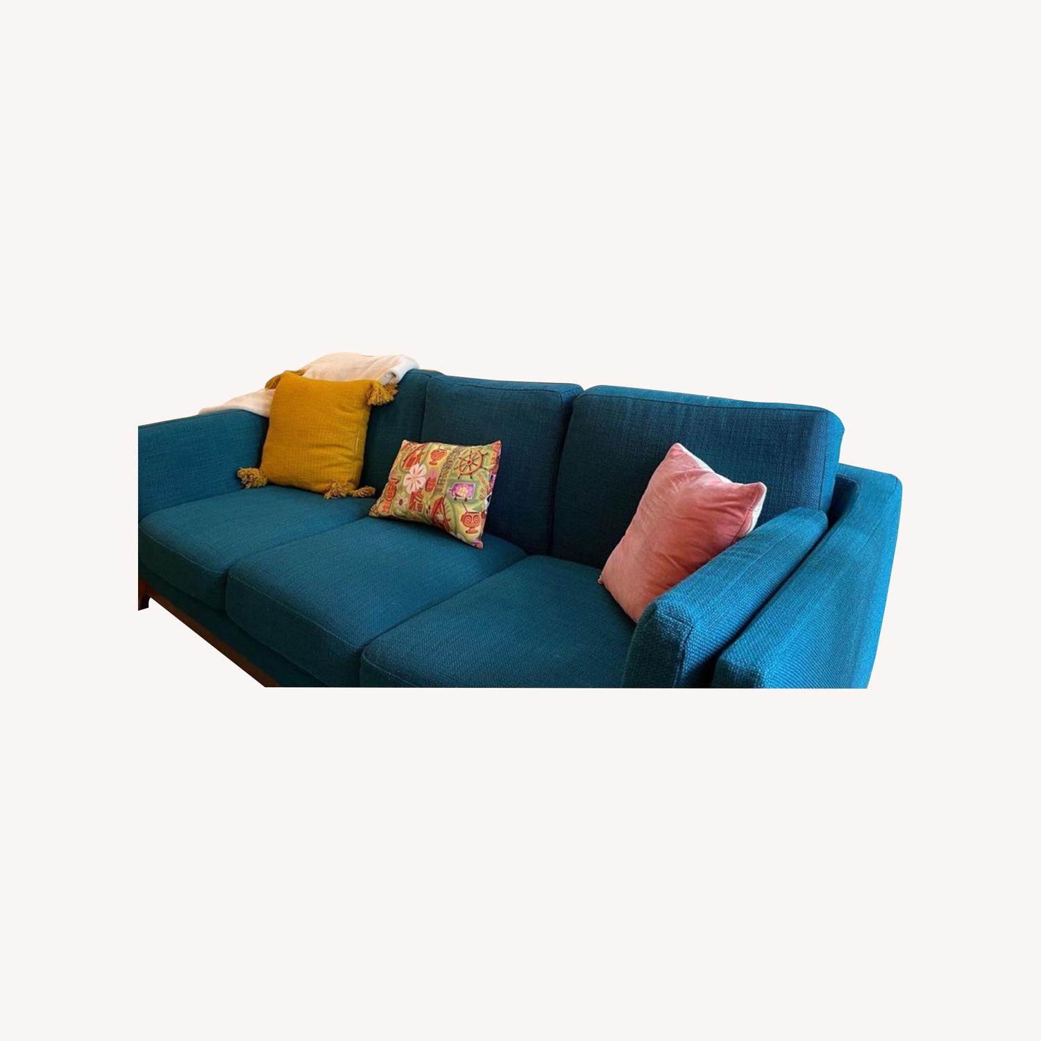 Seller's Notes:Article Ceni three seat sofa in Lagoon Blue - purchased in 2020 and in good condition. We love the mid century look of this couch but it’s bit too small for our new space. The fabric is woven and we do have a cat but I’ve trimmed and fabric shaved any loose threads and pills and will give it a thorough vacuum before pickup. Happy to provide more pics if needed!