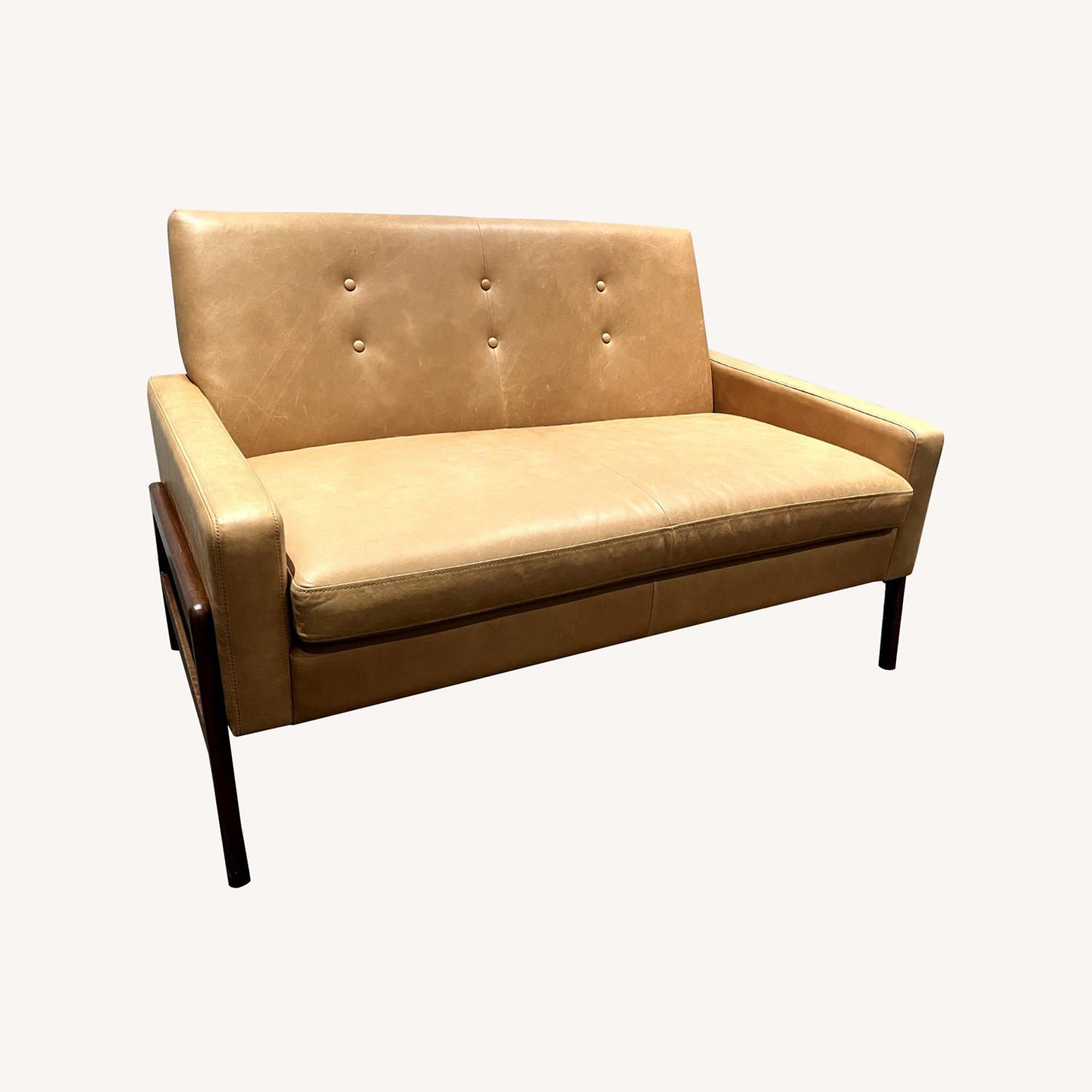 Seller's Notes:From the trendy midcentury modern brand "Article", this is a lovely leather loveseat with a warm, tan finish.