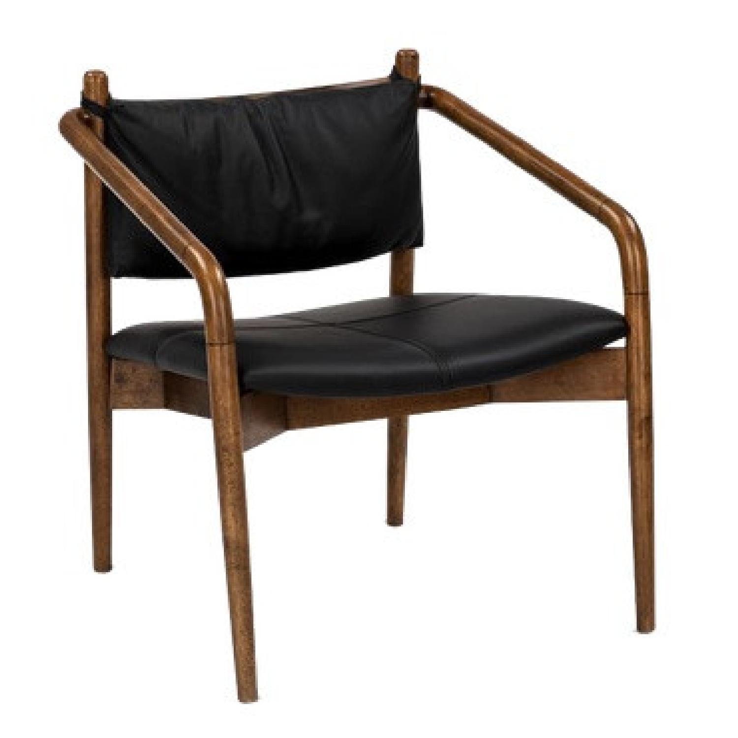 Seller's Notes:This chair looks like a musician that aged really, really well. The Lento black leather lounge chair is made from solid, walnut-stained wood frame. This black leather lounge chair is equal parts functional and sexy: its comfortable foam-padded seat and durable buffalo leather upholstery makes this perfect for leaning into a boisterous conversation, or for quietly contemplating your next move. FEATURES Constructed of solid wood and wood veneer in a Light Walnut stain Comfortable foam padded seat Upholstered in a durable Buffalo leather Clean and sturdy wooden legs No assembly required