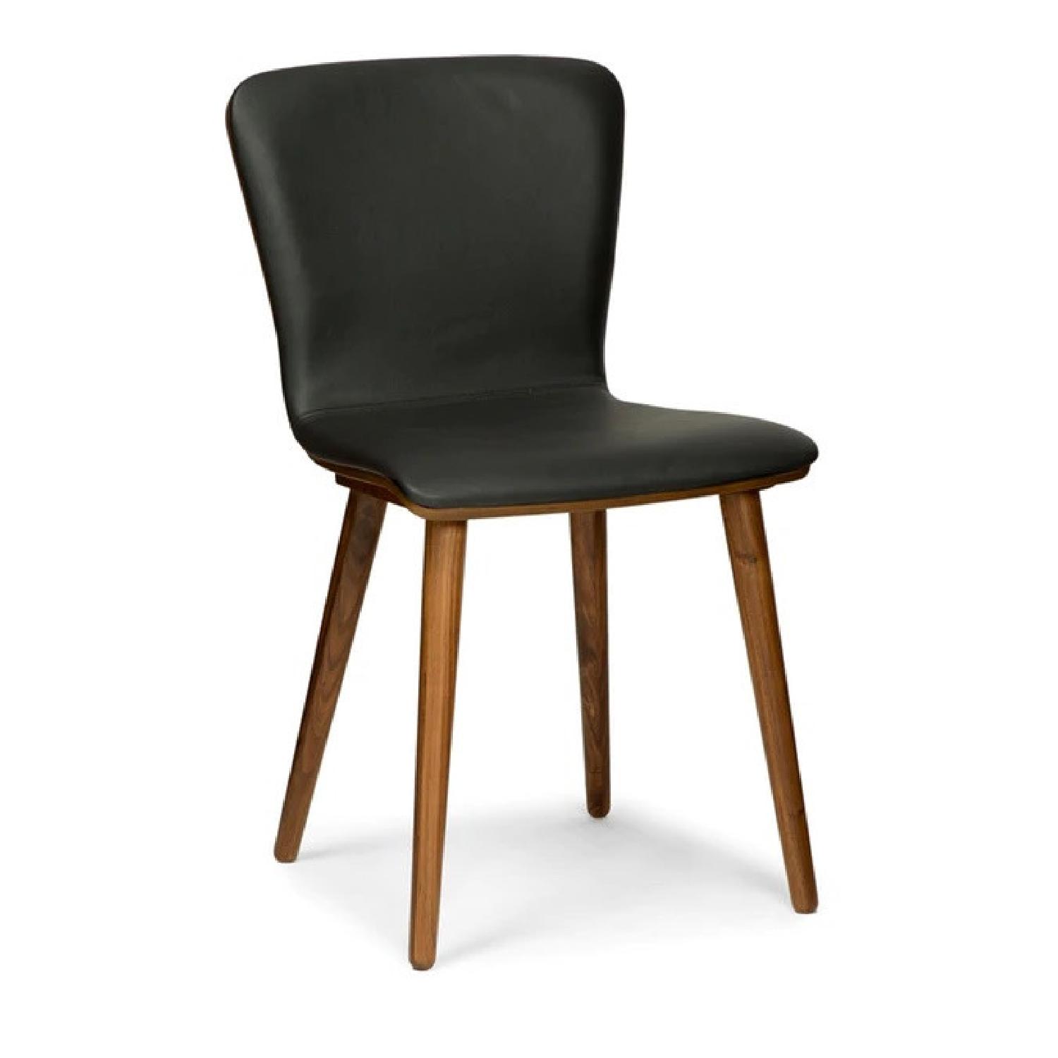 Seller's Notes:Black tie but dressed down. The Sede black leather walnut dining chair is all the elegance of a fancy dinner party, but with the laid-back air of a buddies’ barbeque. These black leather dining chairs are set atop slender, solid walnut legs. Pigmented leather makes for upholstery that will last the test of time… and the test of a few raucous dinner parties.