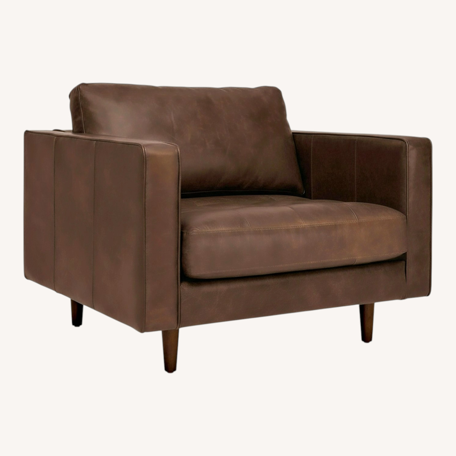 Seller's Notes:Our most popular sofa, reimagined as a large, cozy lounge chair. This modern take on a mid-century classic features clean lines, a tufted seat, and a luxuriously stuffed back cushion. Two matching round bolsters complete the look. Natural color variations, wrinkles and creases are part of the unique characteristics of this leather and it will develop a vintage slouchy look with regular use.