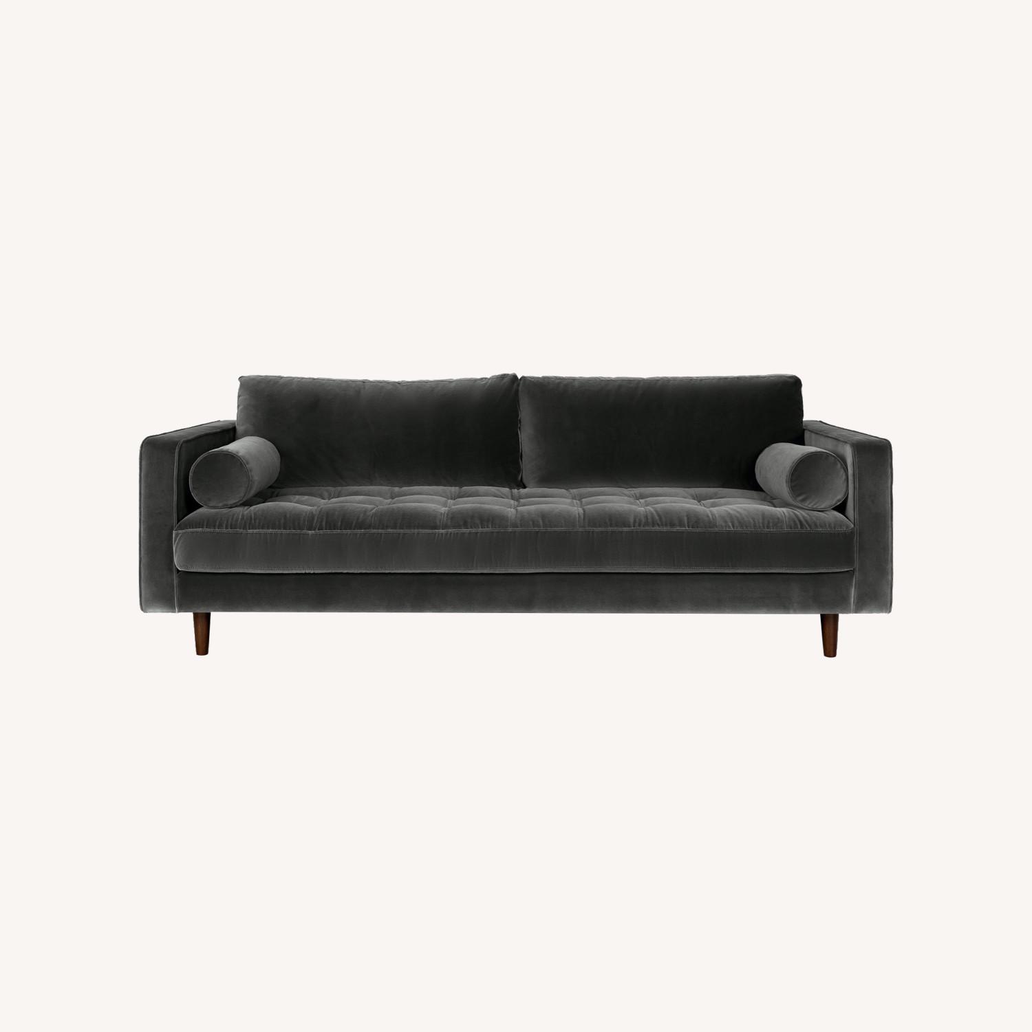 Seller's Notes:This couch is amazingly comfortable and everyone who sits on it loves it and asks where it is from!!! It can also easily be used as a daybed or a comfortable place to house guests if needed. The velvet is so luxurious and the cushions are amazingly soft. Perfect size for an NYC apartment, without feeling like an apartment couch! The photos show all the drink stains on the couch. They are all from milk (small children) and one coffee stain. These can easily be cleaned by a professional couch cleaner (at their most basic level!). We are a completely pet and smoke free home so there are absolutely NO odors. This is Article’s most popular sofa!! It is mid-century style with classic features crisp lines, a tufted benchseat, and two luxuriously stuffed back cushions but with a modern twist!!! FEATURES Sturdy corner blocked wooden frame High density foam with polyester filling Cotton Velvet upholstery Pirelli webbing Loose seat and back cushions Loose bolsters included Simple assembly required (approximately 5 minutes) CARE INSTRUCTIONS Fabric - dry clean only. Keep out of direct sunlight, prolonged exposure will cause fabric to fade.