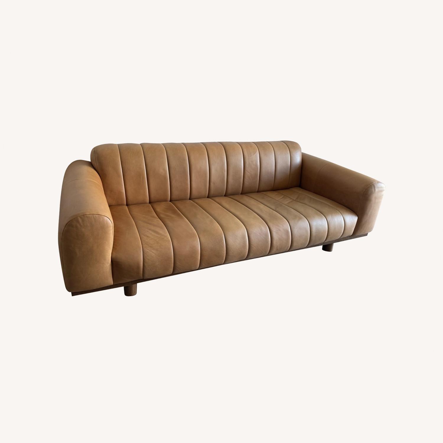 Seller's Notes:Article brand Texada Taos leather sofa in tan full grain aniline leather. Mid Century modern, interesting, and clean lines. Great for both boho or dark academia looks alike. Lived in a house with an old cat who doesn’t use furniture as a post. Cleaned with aniline leather cleaner and conditioned.