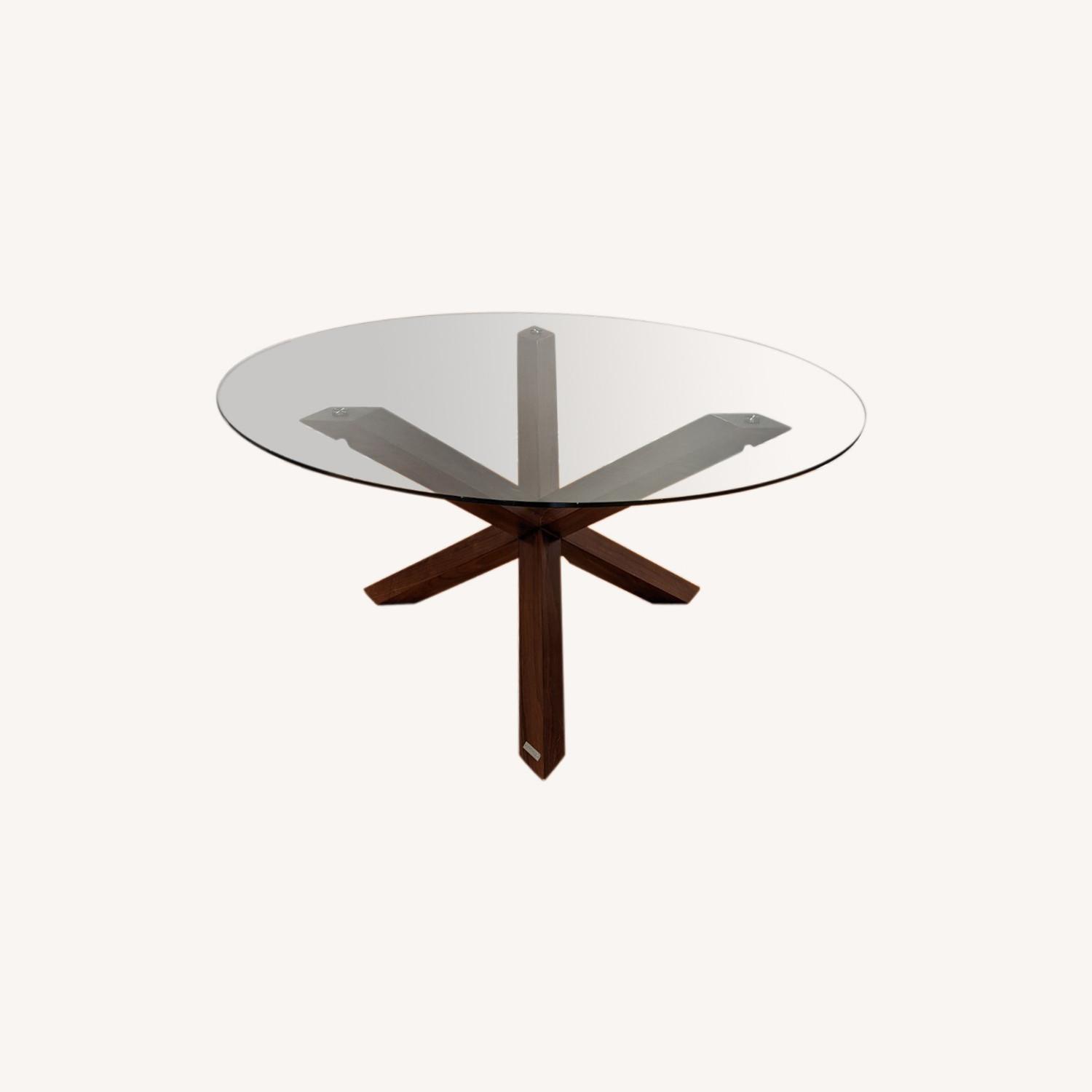 Seller's Notes:Mid-century modern design, glass table with modern walnut legs.
