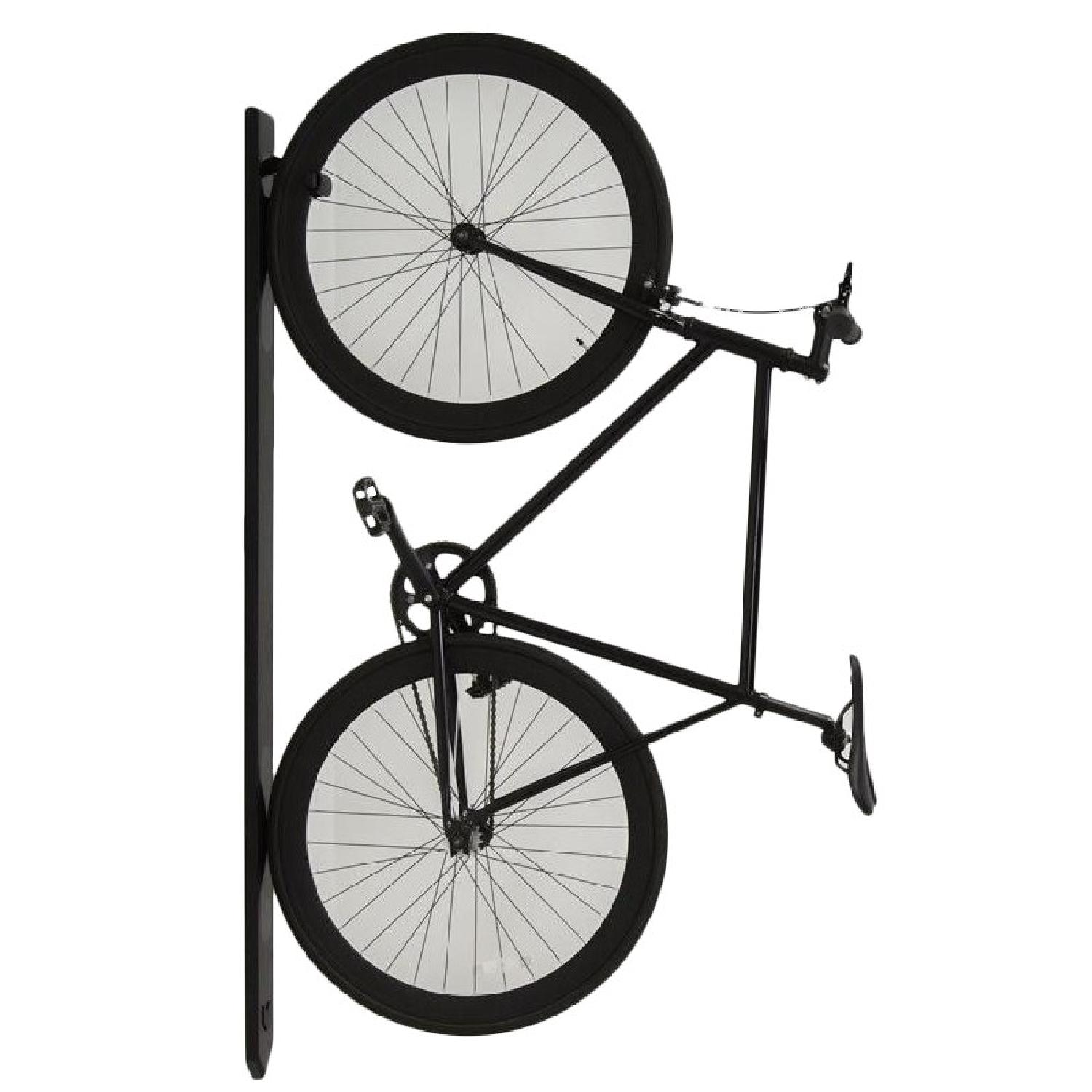 Seller's Notes:This vertical bike RACK brings your ride out from the garage and into your living space. Its unique mounting system self-levels along any surface and stays hidden with a cleverly placed magnet. Made from solid white oak, stained with pure black ink and sealed with a satin finish to highlight the natural woodgrain. RACK handles most sizes and styles of bikes and works well in tight spaces. Designed and made in the USA. Compatibility: Fits all combined bike tire + wheels up to 3.25" depth SPECS L 64" x W 3.5" x D 4.5" Weight 7.5 lbs MATERIALS Solid hardwood Powder coated steel Rare earth magnets Leather Included: 1 RACK, Mounting Hardware Note from owner: We LOVED the minimalist look of this bike rack - makes your bike a piece of art. Our bike is not set up on a trainer so we no longer need a wall mount. Highly recommend.