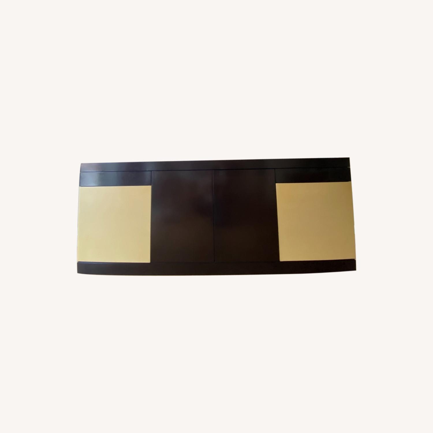 Seller's Notes:One of a kind, Artisan made black lacquered wood sideboard. I purchased this sideboard from a cabinet-maker « Ebeniste » who designed and built the piece in his studio in Mexico City. It’s made of solid wood, doors have white lacquered solid leather. Great condition. No smoke or pets in my apt. I will be moving to a smaller apartment and unfortunately it does fit. It has 2 drawers and 4 doors, making it great for storage, as well as a unique accent piece.