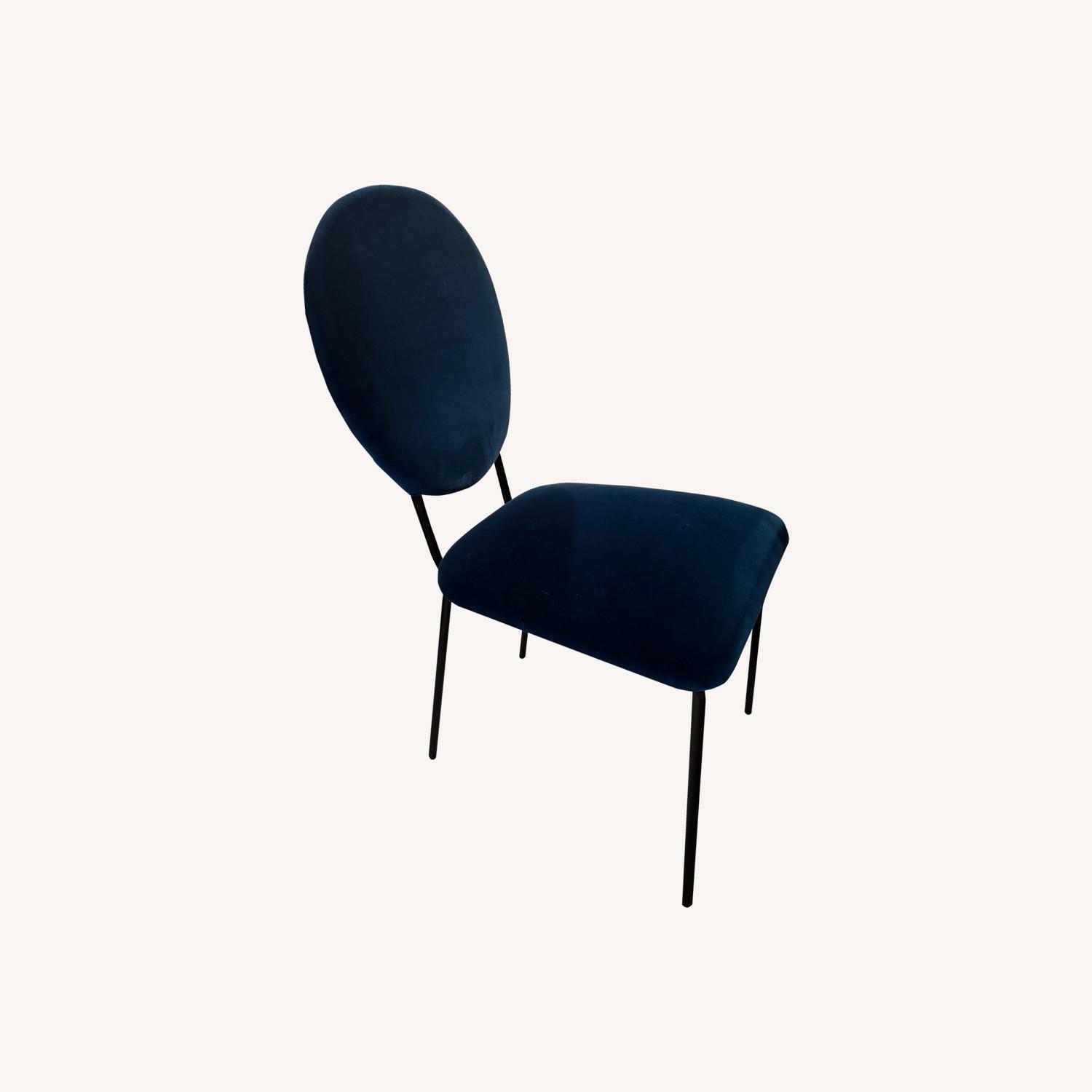 Seller's Notes:Paid $1,475 for each chair in the set. Cannot purchase from Artistic Frame retail, only for trade accounts / interior designers. Elevates dining any space. Interior designer selected custom fabric - gorgeous blue velvet material with raw silk backs and sturdy black metal legs.