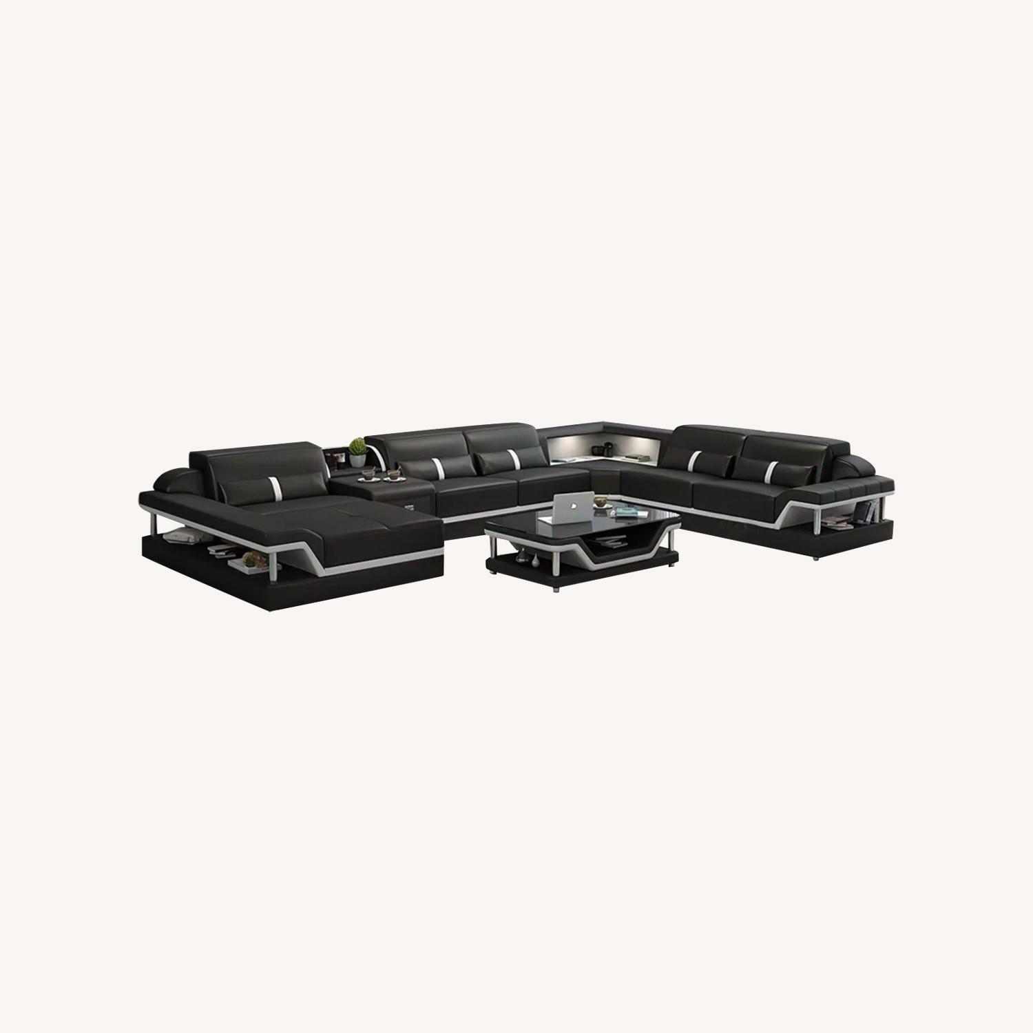 Ultramodern relaxation. This U-shaped corner sectional creates a futuristic look with its sleek, streamlined silhouettes and eye-catching accents. There's a built-in side table for drinks and snacks, while storage spaces beneath each elevated armrest are just the right spots for books and decor. A small storage console lets you tuck away magazines and remotes, so they're not in the way. This sectional has a solid and engineered wood frame that's wrapped in genuine leather, and it rests on multiple cylindrical metal legs with a shiny silver finish. Foam-filled seat cushions along with multiple toss pillows provide plenty of support as you relax. The larger tables in the images are sold separately. Note: Coffee Table & TV Stand Excluded