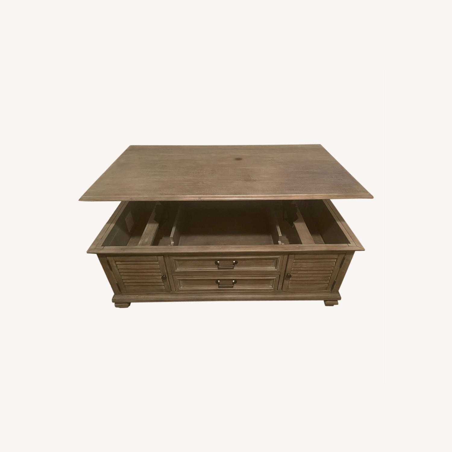 Seller's Notes:Featuring a lift-top function, this Ashford cocktail table is perfect for eating takeout during your favorite TV show or working from the comfort of home. A beautiful neutral finish with distressing outfits the sturdy frame and provides a casual even rustic feel. Plus, plentiful storage allows places to put magazines, remotes and more!