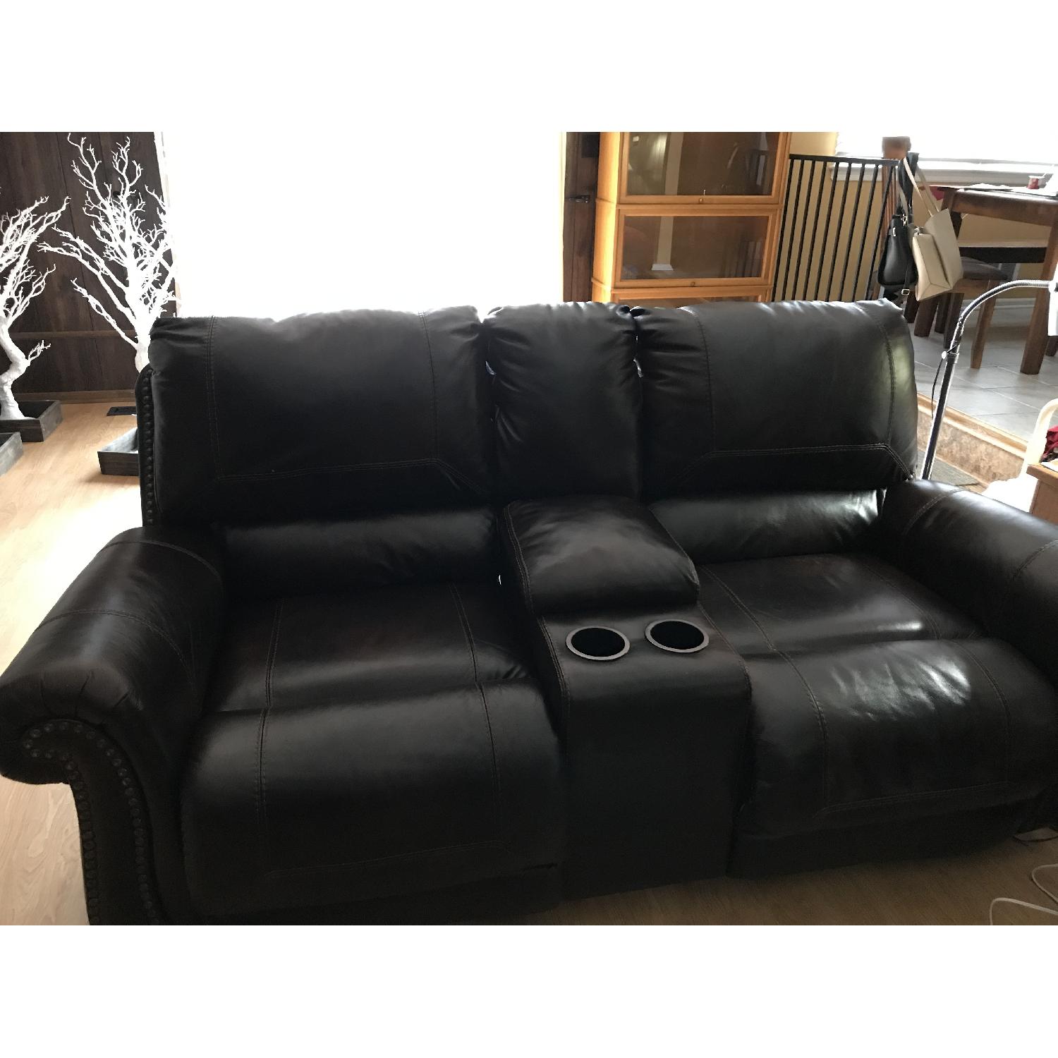 Seller's Notes:Dark brown leather 2 seater recliners with middle console and nailhead trim. We are moving and the couch does not match the style of our new home.