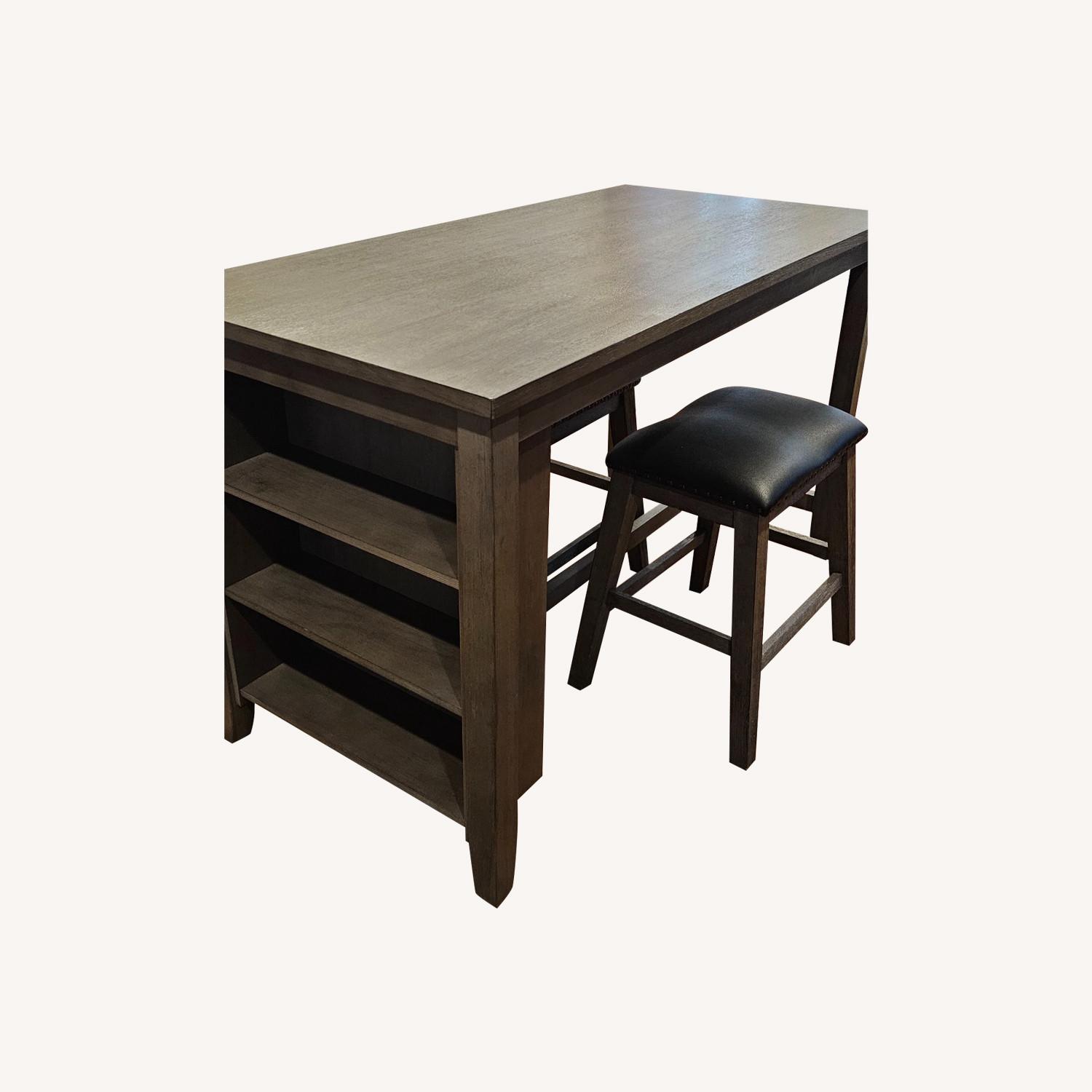 Seller's Notes:Dark grey. Great, clean look for kitchen, dining room, accent wall. One small scratch (Includes in pictures. Circled in red to give perspective on size of scratch). Hardly used. Selling only because we are remodeling home. Dimensions Width: 30.00" Height: 36.00" Depth: 36.00" Additional Dimensions Table Width : 30.00" Table Depth : 36.00" Table Height : 36.00" Apron to floor: 32.25" Opening (3) Width : 22.50" Opening (3) Depth : 7.13" Opening (3) Height : 8.38" Barstool (2) Width : 21.38" Barstool (2) Depth : 16.38" Barstool (2) Height : 24.63" Barstool footrest height: 8.25" Seat width: 18.25" Seat depth: 13.88" Seat height: 24.63"