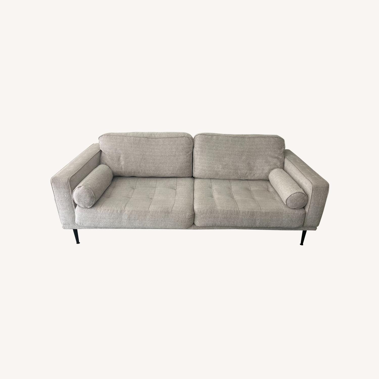 DESIGNER LIVING: This delightfully neutral sofa with 2-over-2 cushion styling includes loose seat and reversible back cushions, track arms, tapered legs and 2 bolster pillows for mid-century flair