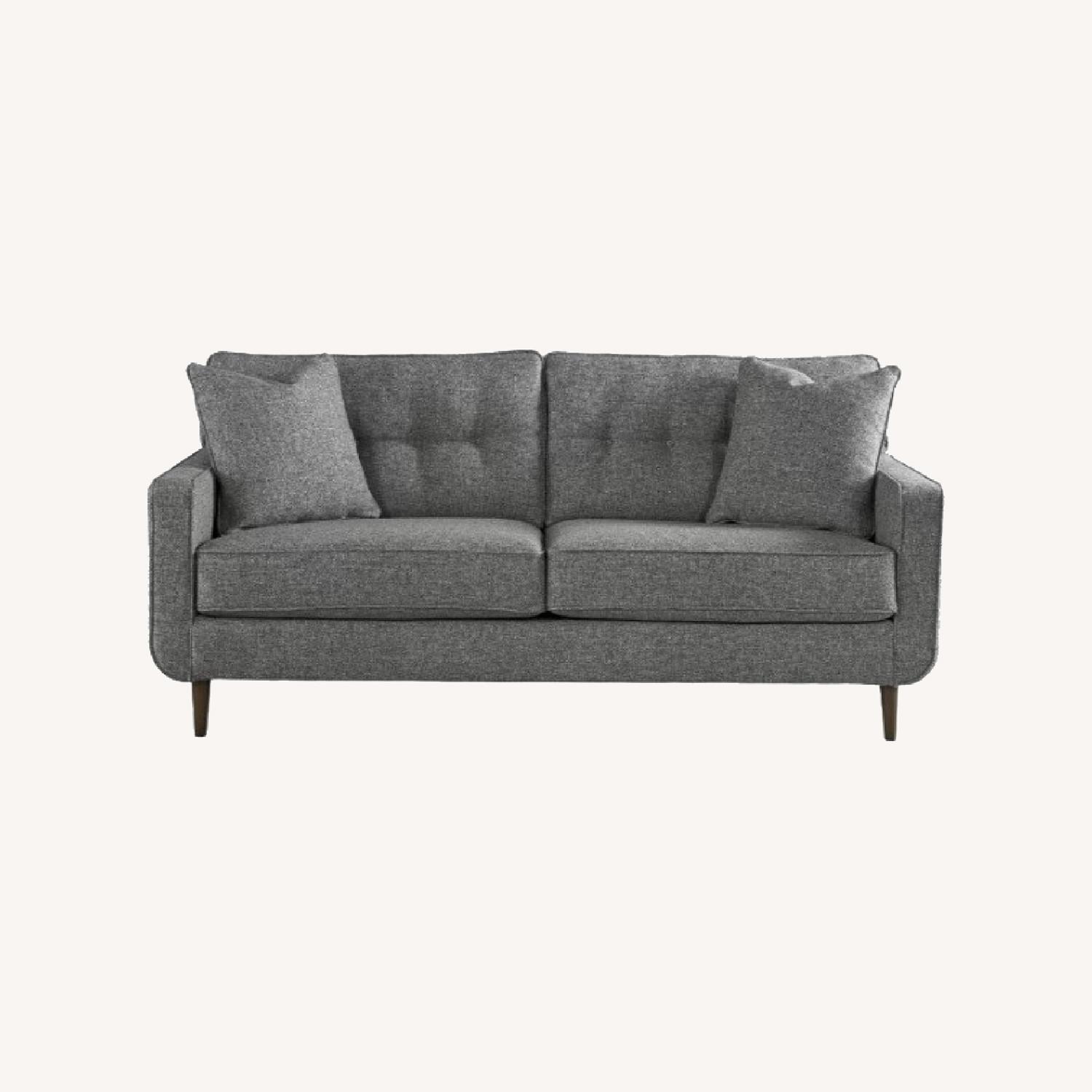 Seller's Notes:Well cared for, 1.5 years old mid-century modern sofa listing at 30% off retail price. Available immediately. No pets, spills stains, or damage whatsoever during prior ownership. Minor wear to back cushions only. Cushions are firm and detachable for fluffing. Two accent pillows included. Perfect for any contemporary Brooklyn apartment. From the manufacturer, Ashely: Feed your mid-century modern nostalgia with a contemporary twist in the Zardoni sofa. Colored in an attractive gray, it’s upholstered in a timeless texture. Classic tufted back and tapered peg legs are a nice revival. Linear profile with two toss pillows adds plenty of fresh style, perfect for small spaces. Corner-blocked frame Attached back and loose seat cushions High-resiliency foam cushions wrapped in thick poly fiber 2 decorative pillows included Pillows with soft polyfill Polyester upholstery and pillows Exposed feet with faux wood finish Excluded from promotional discounts and coupons Fabric Details: Polyester (100)%