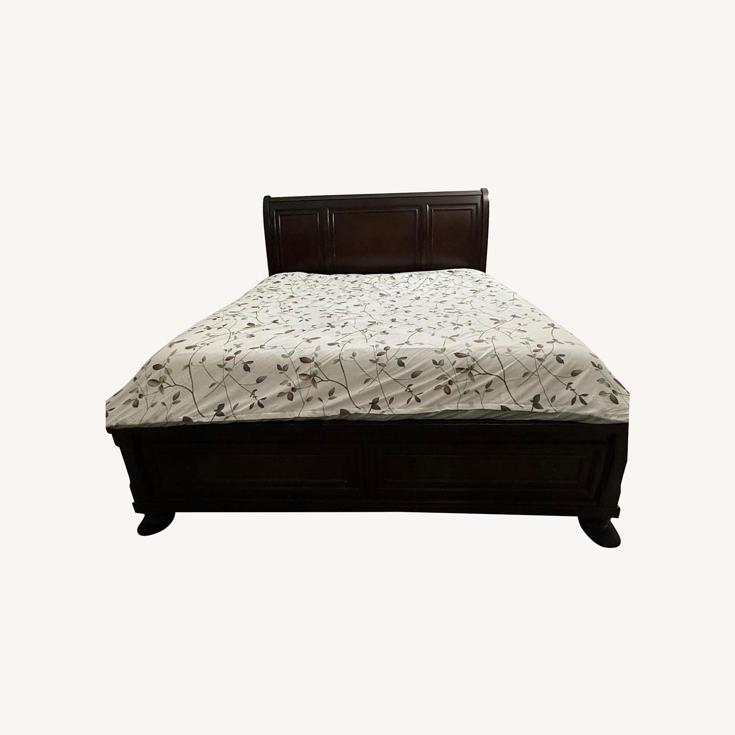 Seller's Notes:Wooden bed frame. Features built-in drawers. Dark wood color. Can create a peaceful place to rest your head after a long day.