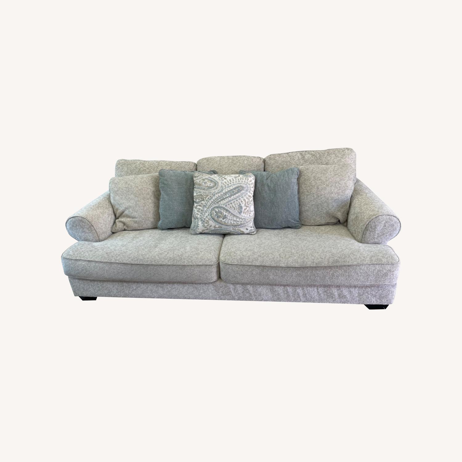 Seller's Notes:Monaghan Sandstone Sofa Comfortable and neutral! Great large and deep sofa that goes well in any space. Used but well cared for and in great shape. Sofa may need some minor spot cleaning. Comes with 5 decorative back cushions. Pick up only. 100% Polyester fabric makes for easy care and spot cleaning Measurements in Inches: 98 Width x 43 Depth x 31 Tall (36 back cushions)