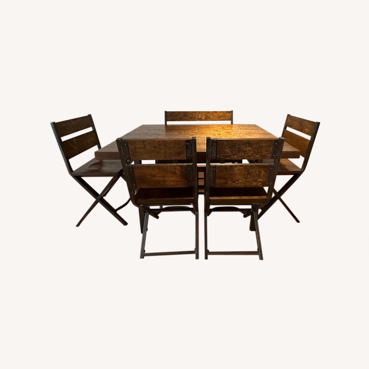 Seller's Notes:Counter height dining set includes table, 4 chairs, and 1 bench seat. This is a "distressed finish" Signature Design by Ashley set that was purchased in 2017-2018. It's traveled with me on my move to another state so there are some scratches and dents in the wood (all pictured above). From the manufacturer: Made with select pine veneers and hardwood solids in a medium brown reclaimed look finish with saw kerf detailing. Metal and wood combination with crisscross leg design with shaped foot rest. Unfortunately, I never use this set because I now live solo and am moving once again. I really don't want to just throw it away, it's still very nice and sturdy and I think a family or group of friends would get great use out of it!