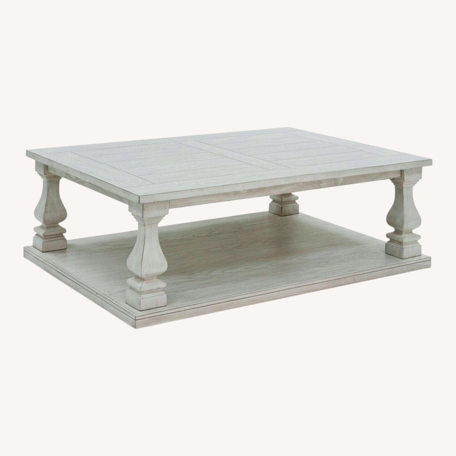 Seller's Notes:I am selling this stunning, oversized coffee table from Ashley Furniture, purchased only 3 months ago. It is in immaculate condition. Condition: Pristine/Like-new. It has been used very lightly and has never held any heavy items. Surface: Flawless. No scratches, no dents, and no water marks. It looks exactly as it did in the showroom. Design: Beautiful antique white finish with a classic distressed look. It features a spacious lower shelf for storage and stylishly carved pedestal legs. Quality: Very sturdy and high-quality piece that serves as a great centerpiece for any living room. Reason for Selling: Relocating and unfortunately cannot take it with me.