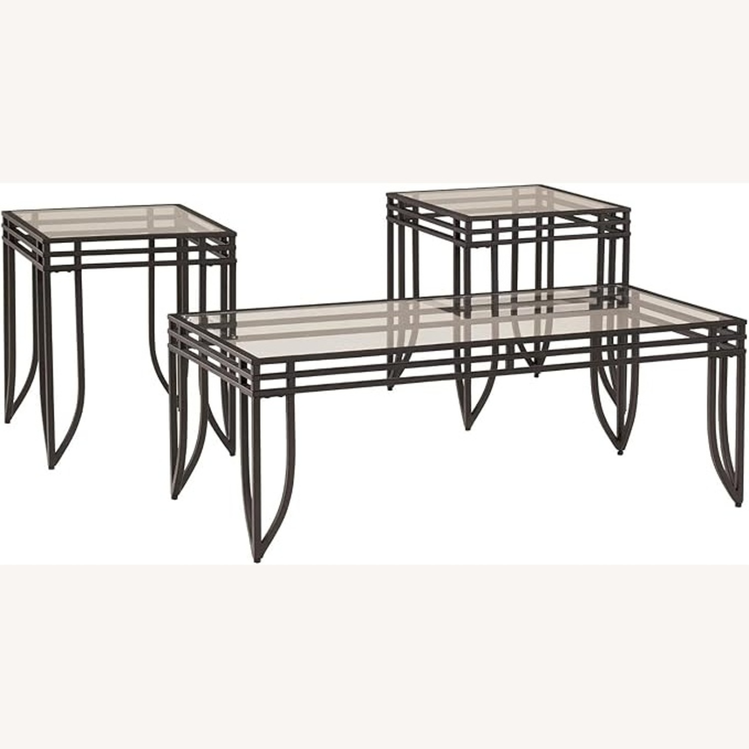 Seller's Notes:CONTEMPORARY COFFEE TABLE SET: If you're a fan of open concept design, you've found your perfect coffee table match. Designed with a graphic metal frame and a clear glass top, this table set enhances an open, airy feel METAL FRAMING: Sturdy metal tubular framing supports clear glass tabletop. Metal frame is finished in a rustic two-tone black and brown hue