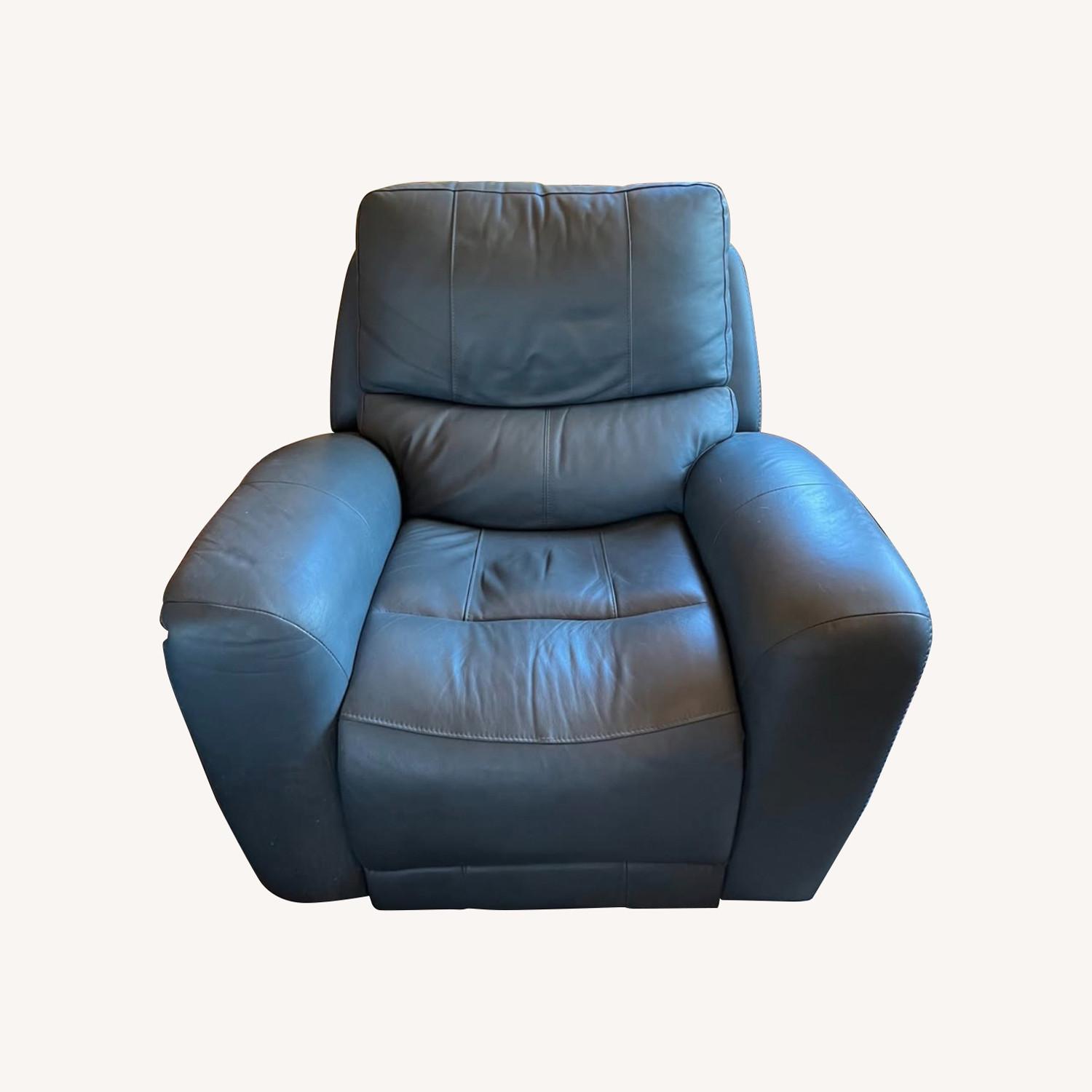 Seller's Notes:Power recliner in air-blue leather. Smooth electric reclining and supportive seating. Great for reading, TV rooms, or relaxing. Clean and in very good working condition.