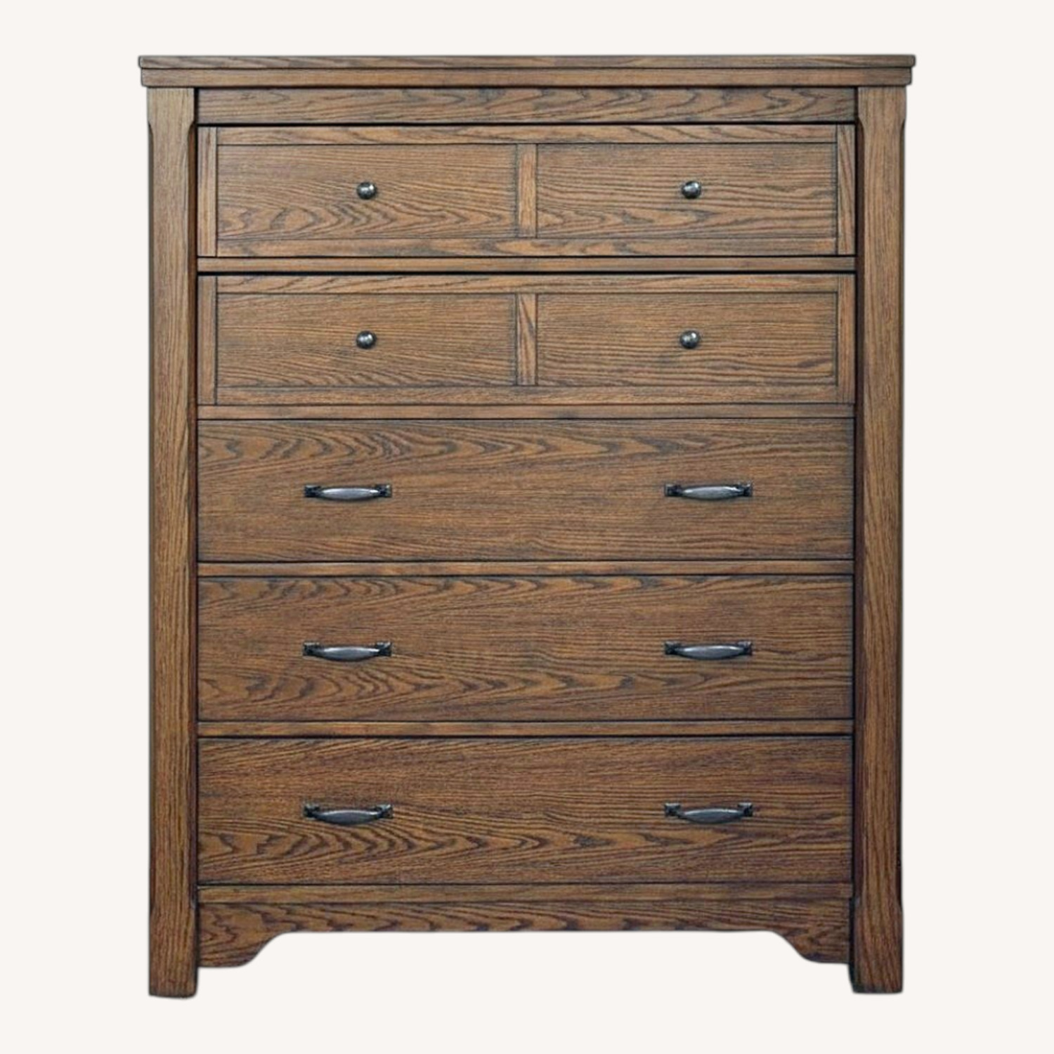 Finish: Burnished oak (vintage casual style) Hardware: Dark burnished industrial look Features: Framed details, plinth base design, routed accents