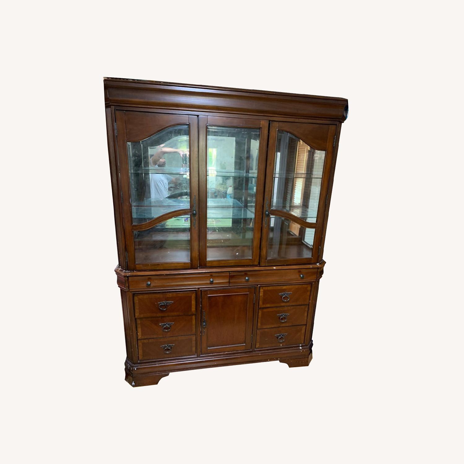 Seller's Notes:80H *58W *18D; Hard wood; Upper Glass case Height 39Inches; Lower 9 cabinets; Good condition, Heavy;