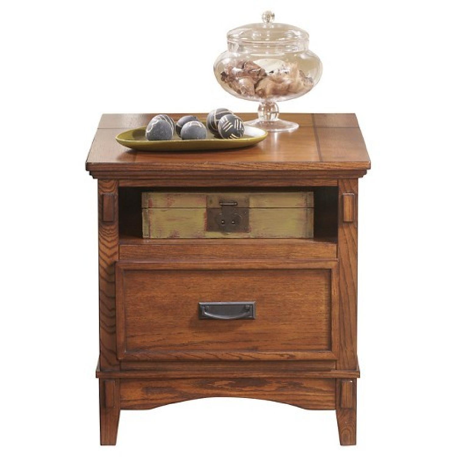Seller's Notes:BECAUSE OF DROPSHIPPING TIME, SHIPMENTS CAN TAKE AROUND TWO WEEKS. A look that's right in line with timeless Mission design. Cross Island end table also marries form with functionality: an open cubby sits atop the spacious drawer. Built-in power strip increases your electrical connectivity.