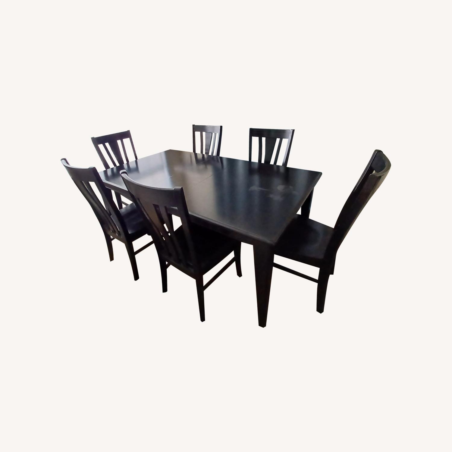 Seller's Notes:Stylish and sturdy solid wood dining set from Ashley Furniture in sleek black. Great for everyday meals, family game nights, or hosting guests. The set includes a spacious table with an extendable leaf and six supportive chairs. Please Note: There is a small stain on the table surface about the size of a hand (see photos). It doesn’t affect the structure or stability, but should be considered when purchasing. Set Includes: • Table: 60" W x 42" D x 29" H • Extendable leaf adds 12" width • Six solid wood chairs: 40" H x 19" W x 18" D Features: 🖤 Sleek black finish that complements many decor styles 🪑 Comfortable, sturdy chairs with supportive backs 👨👩👧👦 Seats 6 comfortably, 8 with the leaf extended ✨ Condition: I am the one and only owner, it has been gently used in only one smoke-free, pet-free home