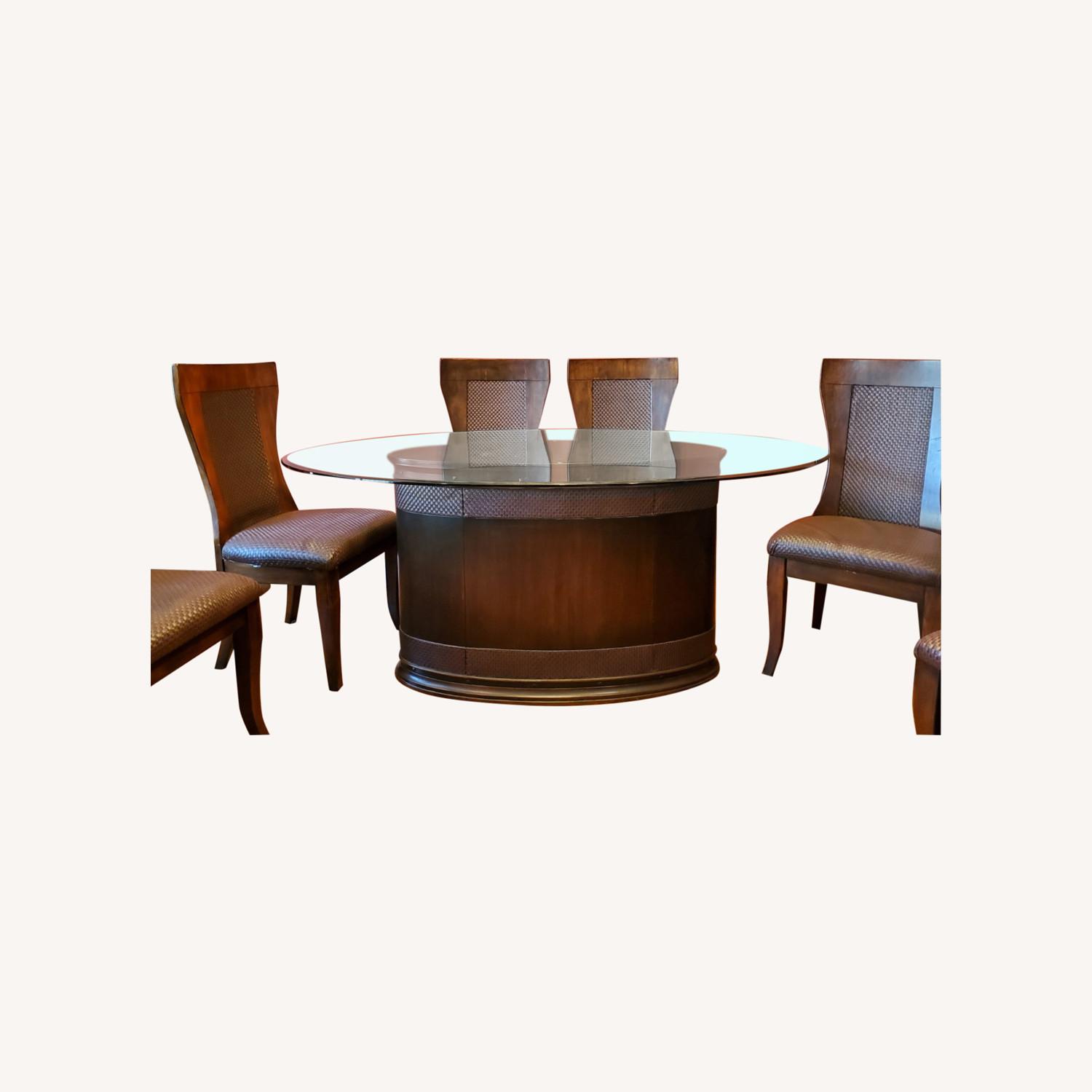 Seller's Notes:Oval bevel edged glass table top with wood and woven leather base. Table top lifts off of base. 6 sturdy wooden chairs with woven leather. The glass top has a few scratches and a couple of the chairs have scratches in the wood. As a whole this set presents as an elegant dining room piece. (Decorative place mats will hide the scratches.)
