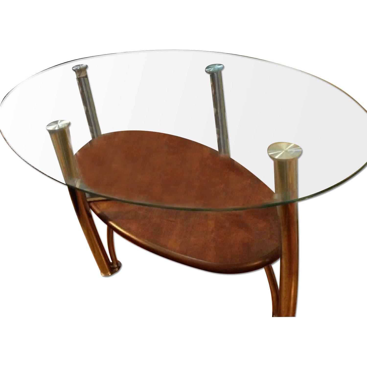 Seller's Notes:Glass-top, metal legs and a wooden shelf beneath the glass top.