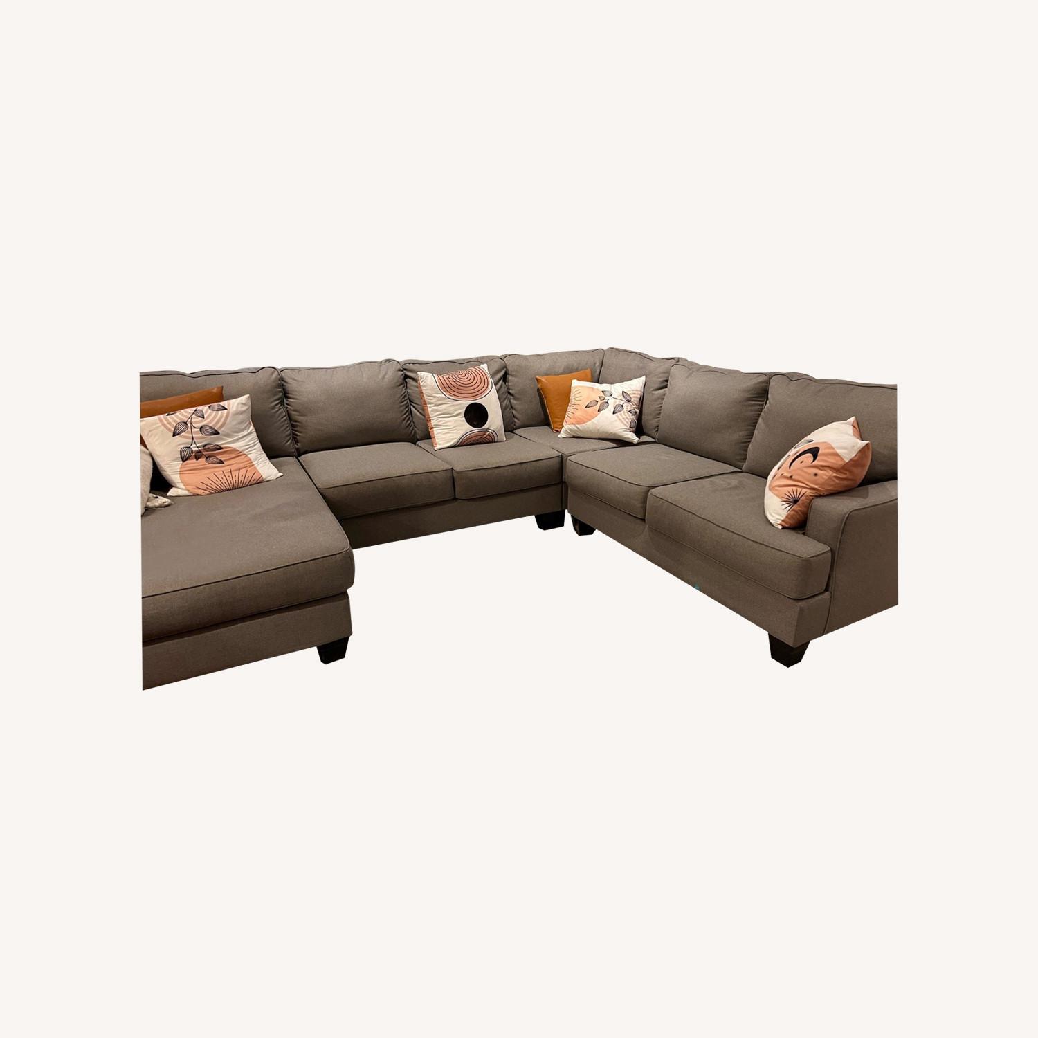 Seller's Notes:5-yr-old light grey sectional with chaise from Ashley Furniture, including pillows for sale. Gently used, no noticeable stains or damage. Moving and it does not fit into the new space. Measurements in picture.
