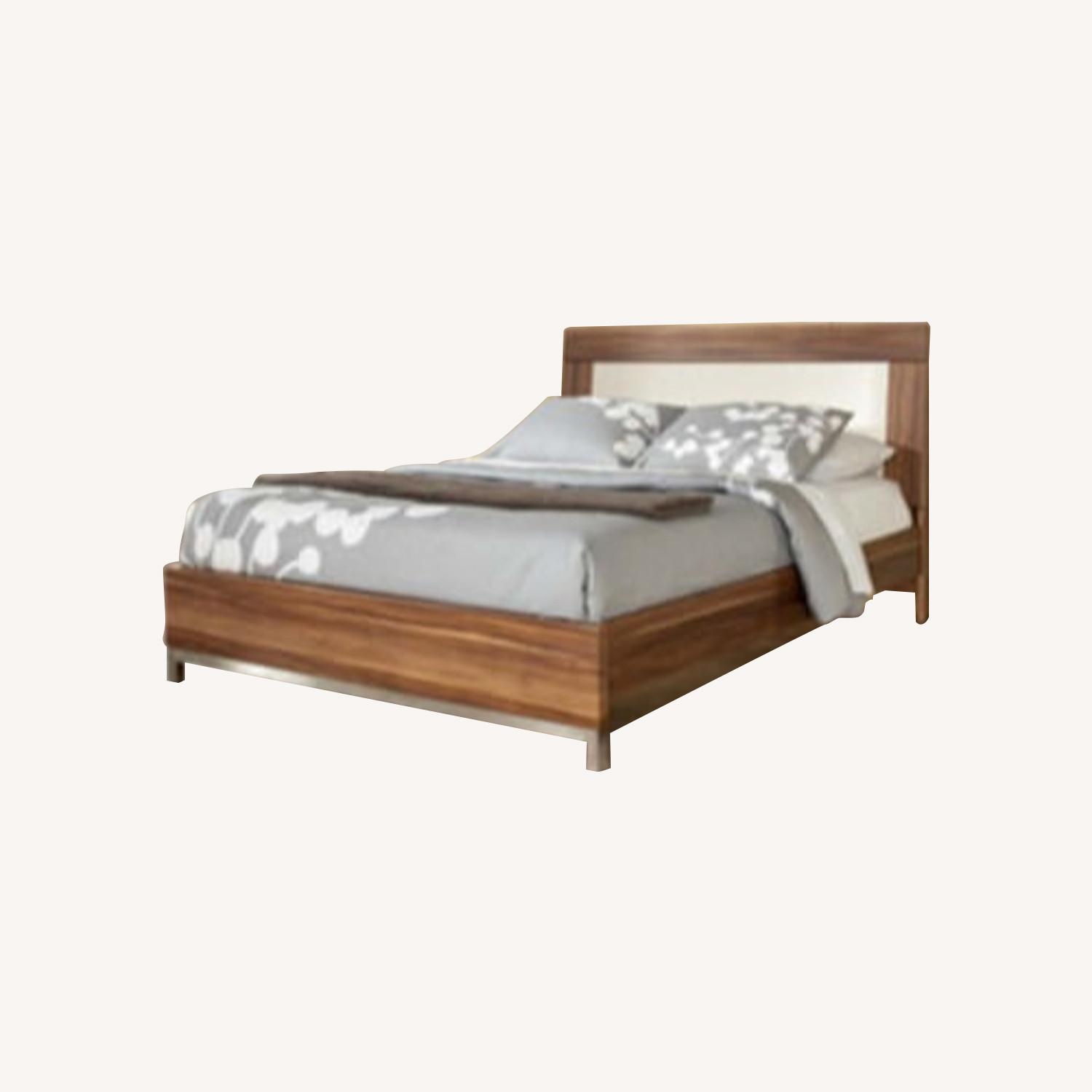 Seller's Notes:Signature Design by Ashley Furniture doesn't require extra words to introduce them. With over 50 years of innovation and experience in the furniture industry, The Signature Design by Ashley Furniture has become an industry leader as a manufacturer of quality furniture products. Rich brown finish over replicated wood grain combined with high gloss taupe color fronts. Top uses 3D press technology for an "infinity edge". Brushed nickel color metal bases on legs. Great condition with only a small notch (1" wide) on side of platform that is covered when sheets are on the bed. **Roll Slats not included** Headboard: 64"W x 5"D x 43"H Footboard: 62.76"W x 83.31"D x 14.02"H