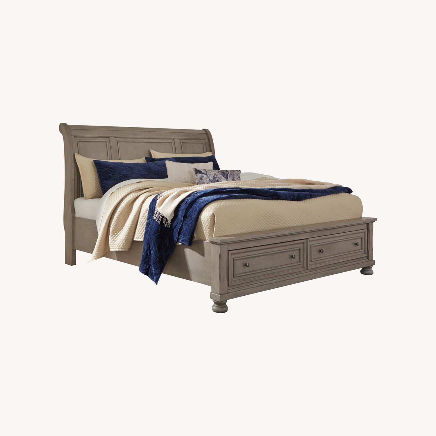 Satisfying your taste for tradition, the Lettner queen sleigh bed with storage sports serene sophistication. Forever classic design details—inlaid panels, silvertone patina hardware and bun feet—are so easy to love. Burnished light gray finish elevates the look with modern sensibility. Two roomy drawers keep your essentials organized in style. Mattress available, sold separately.