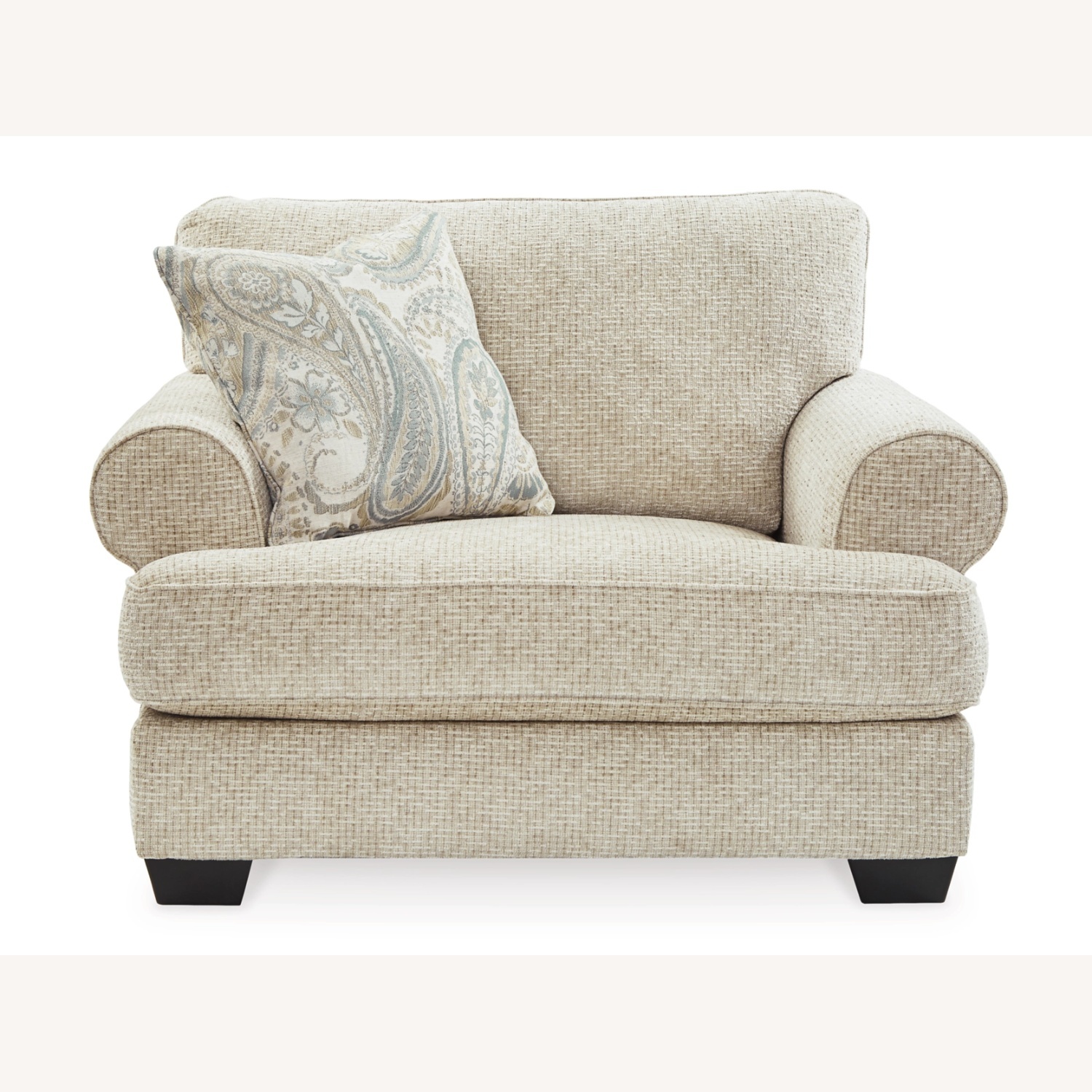The Monaghan oversized chair strikes a beautiful balance between classic and current. Its traditional elements include t-cushion seating and setback roll arms, angled for modern flair. A jacquard paisley pillow makes a muted, mellow complement to the chair’s casual textured chenille upholstery. And the choice of sandstone beige is a light and lovely style awakening.