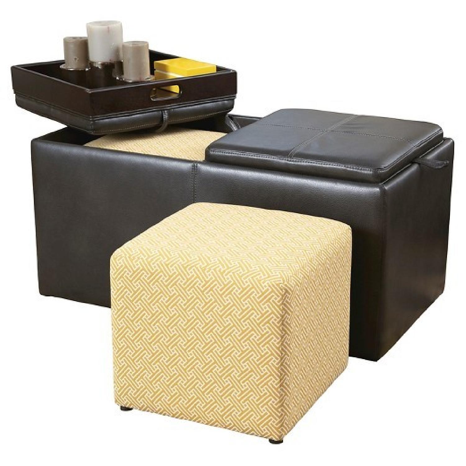 Seller's Notes:Ashley Furniture Signature Design - Hodan Ottoman with Storage Lift the ottoman’s two top cushions and discover two smaller ottomans upholstered in an ultra-mod geometric pattern. Flip over the faux leather ottoman tops to convert them into serving trays/table space. -High-resiliency foam cushions wrapped in thick poly fiber -Polyester/rayon interior upholstery; polyurethane exterior upholstery -Storage under removable tops -Stationary tray tops with faux wood finish Scratches can be seen along edges of tray tops (see photos). Any questions, please ask. Thanks.