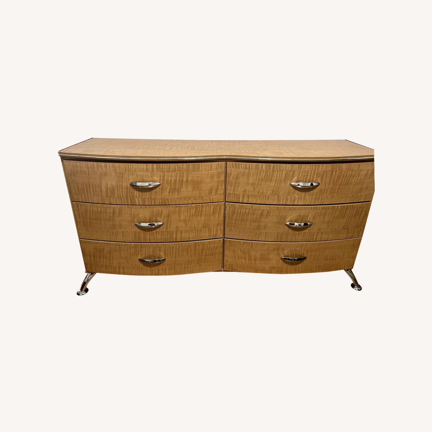 Seller's Notes:Ashley Furniture six-drawer dresser in high gloss figured horizon maple grain with chrome finishes. Spectra collection, model # B250-31. Side roller glide drawer systems. It has some wear and tear from a move—scratches on one front drawer, and the back panel is warped. The dresser is very sturdy and solid otherwise.