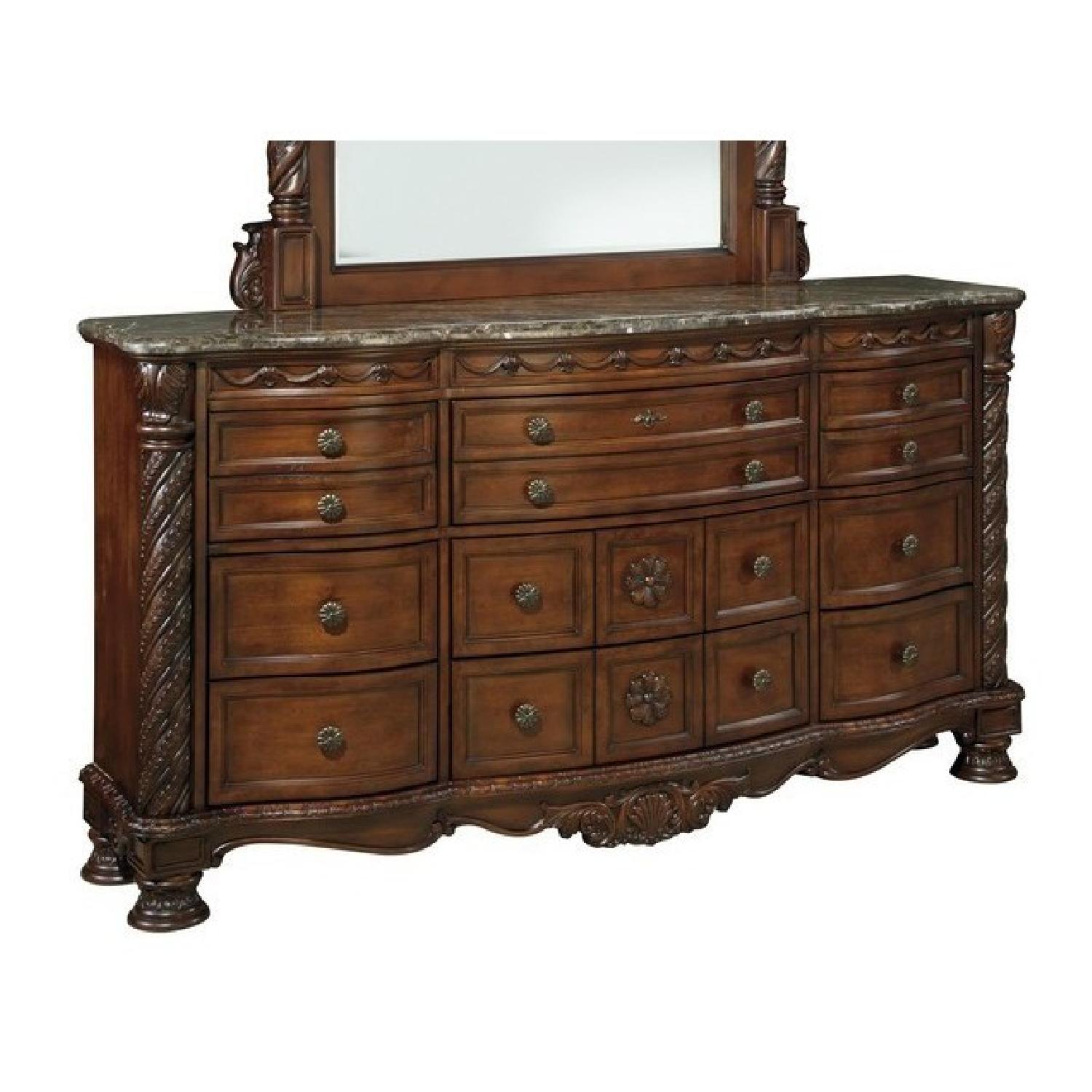 Seller's Notes:BECAUSE OF DROPSHIPPING TIME, SHIPMENTS CAN TAKE AROUND TWO WEEKS. A rich traditional design and exquisite details come together to create the ultimate in the grand style of the ""North Shore"" bedroom collection. The opulent brown color flows beautifully over the decorative pilasters and ornate detailed appliques to create a rich elegant atmosphere to any home environment. With a serpentine shaped design and inlay stone veneer tops, this furniture collection takes traditional style to the next level. Transform your bedroom with the rich style of the ""North Shore"" bedroom collection. Made with select hardwood veneers, hardwood solids and furniture grade resin. Dark casual finish. Dark color metal accents & hardware. Large scale decorative pilasters and ornately detailed appliques. Beveled mirror. Serpentine shaped drawer fronts. Diamond patterned inlay stone veneer tops on dresser and night stand. Framed drawer fronts. Cedar veneer or felt lined drawer bottoms. Concealed drawers in night stand and armoire base. Armoire features a pull-out back & adjustable shelves. Mansion sized posterbed with upholstered headboard panel. Inlaid marble veneer caps on panel footboard. Upholstered bench seat.