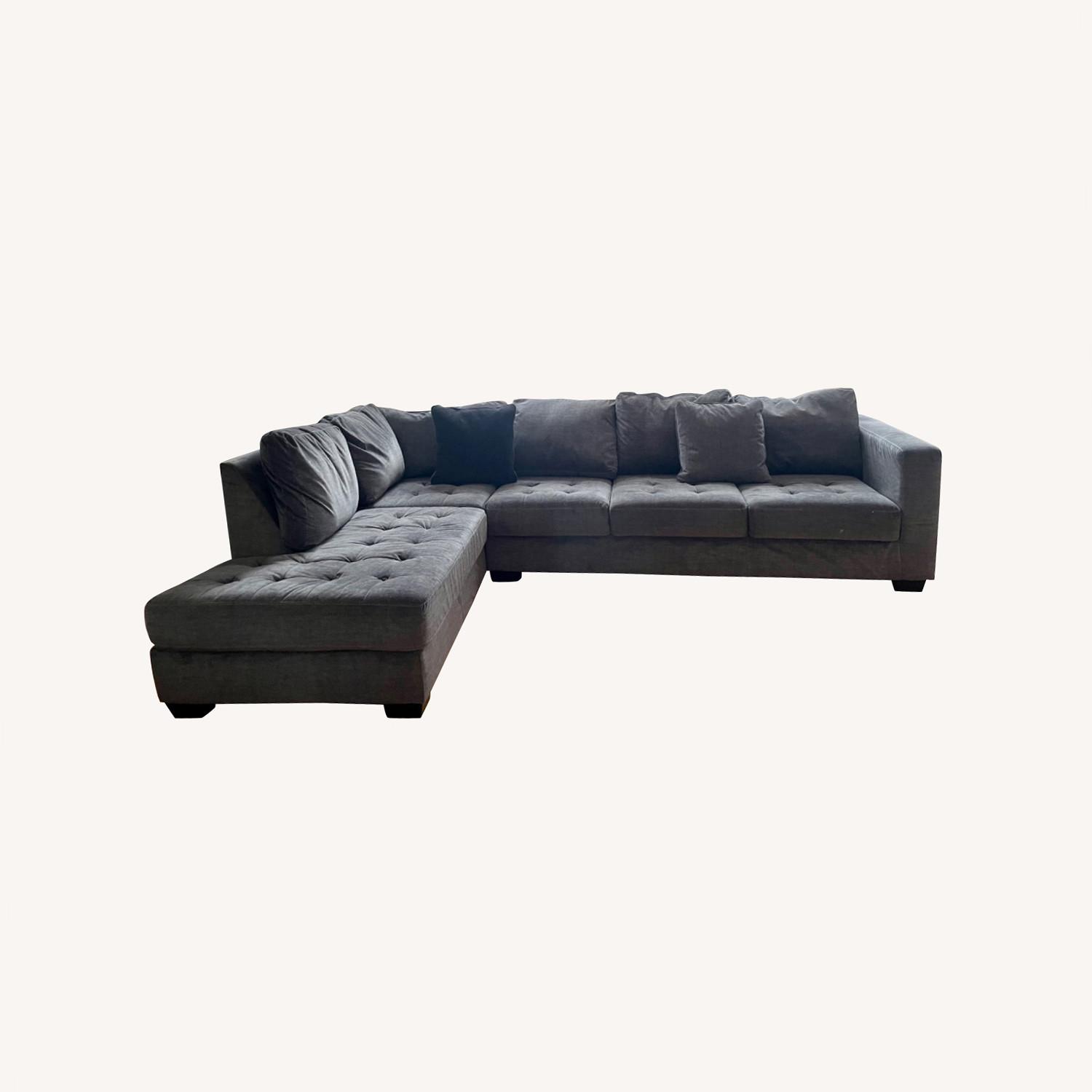 Seller's Notes:For sale is a 5 year old gray sectional sofa with chaise. The item is in great condition, with a minor cosmetic blemish to one cushion as shown in the pictures, and one back cushion being flatter than the rest. This couch was from a pet friendly home, but has come out unscathed from scratches and permanent damage. It has been cleaned and cared for regularly. We hate to part with this comfy sofa, but after moving to a small apartment it’s just a little too big for our new needs.