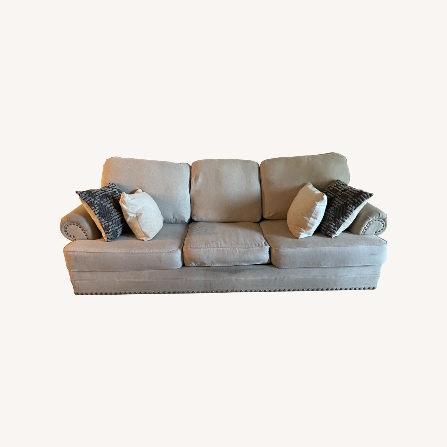 Seller's Notes:I love this couch! It’s super comfy and very easy to turn into a bed. I would keep it for much longer if I could, but unfortunately it won’t fit in my new apartment. - Ashley Furniture Pull-Out Couch. - Dimensions: L 91 x H 34 x W 41 inches - Queen Size Pull-Out Bed (sold disassembled for easier move). - Removable and Washable Cushions Covers - 4 Throw Pillows Included - Original Price $1,200 - Conditions: Signs of Usage, Small Stains on Cushions (not visible depending how the cushions are flipped), Small Paint Stain on the Back (not visible with cushions on - see pic for reference)